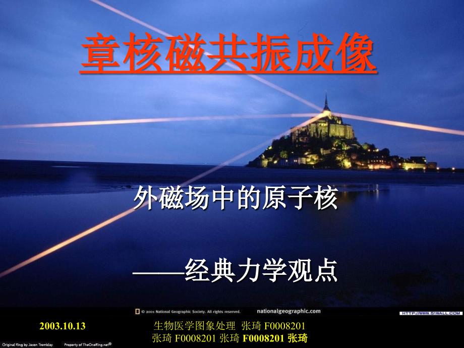 核的自旋是永无休止的运动Lrcmg.2003.10.13生物医学图象处理 张琦 F0008201 张琦 F0008201 张琦 F0008201 张琦 拉莫进动拉莫进动磁距的进动频率为: 或 磁感应强度 旋磁比 式中的“”号表示:按右螺旋规则规定的 的方向与相反, 也就是进动的方向是顺时针时,相应的磁场应穿出中面2003.10.13生物医学图象处理 张琦 F0008201 张琦 F0008201 张琦 F0008201 张琦 拉莫进动拉莫进动动量矩定理: 力矩作用在具有角动量(动量矩)为的刚体上,将引起动量矩的变化为原子核的动量矩,则为核在外(静)磁场中受到的力矩:现根据经典力学的规律来阐明进动现象现根据经典力学的规律来阐明进动现象现根据经典力学的规律来阐明进动现象现根据经典力学的规律来阐明进动现象: : : :则:2003.10.13生物医学图象处理 张琦 F0008201 张琦 F0008201 张琦 F0008201 张琦 拉莫进动拉莫进动由 两边同乘 上式变为: 以 代替 并设磁场沿轴取向,即:2003.10.13生物医学图象处理 张琦 F0008201 张琦 F0008201 张琦 F0008201 张琦 拉莫进动拉莫进动按矢量积公式展开:或:或:归并得:归并得:2003.10.13生物医学图象处理 张琦 F0008201 张琦 F0008201 张琦 F0008201 张琦 拉莫进动拉莫进动令 : 分别为时,分别为时, 的初始值。