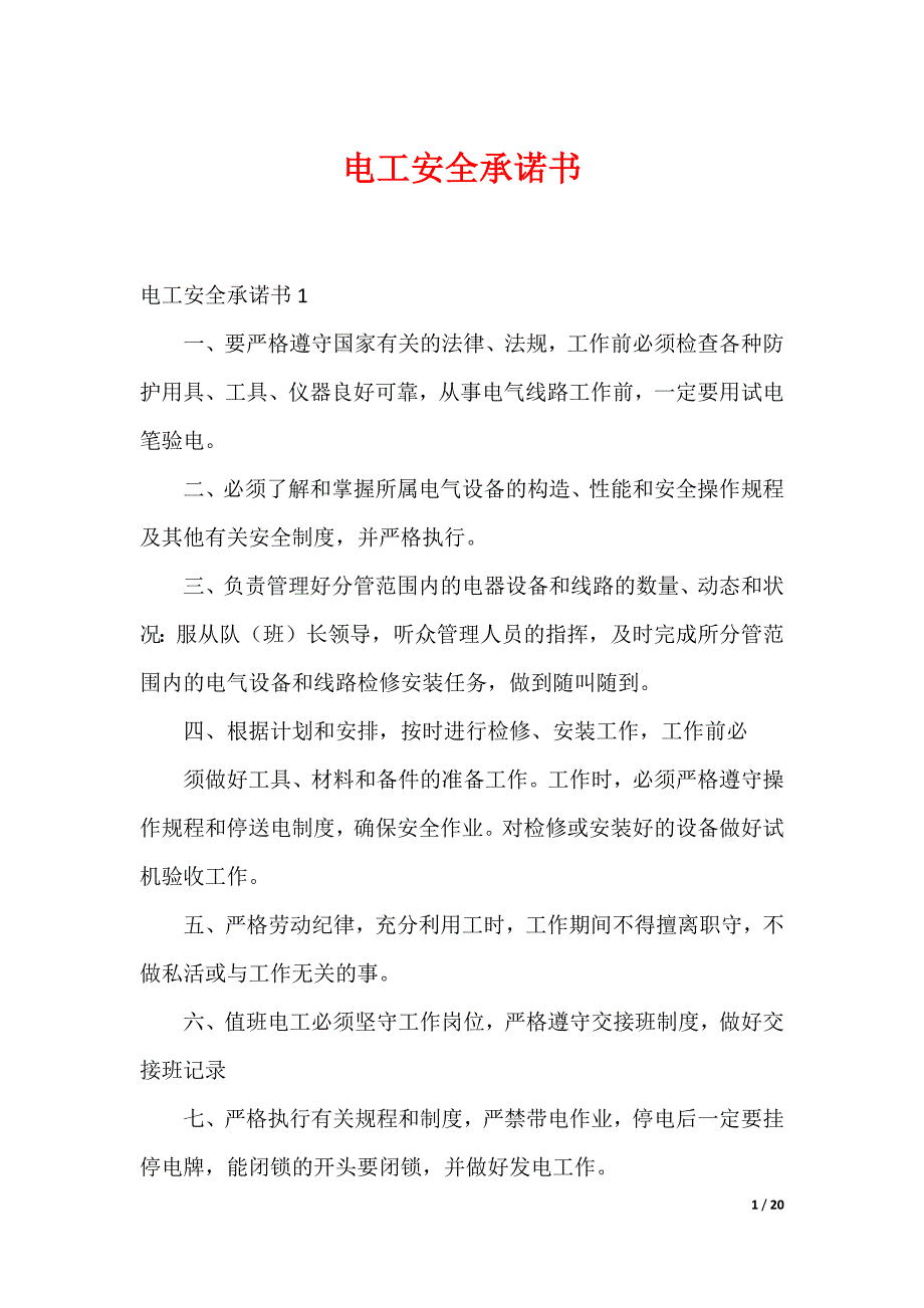 13、不在禁烟区内吸烟 14、正确使用劳动防护用品 15、熟练掌握本岗位各项事故应急措施,发现异常情况及时处置,不延误时机 备注:以上项目奖罚措施参照公司 5S 管理制度、以及公司内部管理 手册执行 注:此书一式二份,一份本人留存,一份公司存档 本责任制时间从 20xx 年 01月 01 日起至任期结束 本人承诺:我已经接受过本岗位安全教育,并熟知安全生产承诺书全 部内容,愿认真执行,如违反本承诺,愿承担相应的责任 甲方:机电主管签字: 年 月 日 乙方:机电技师签字: 年 月 日 电工安全承诺书6 安全工作是煤矿工作的重中之重,对安全的懈怠就等于对生命的轻视,安全工作要从我做起,从小事做起,要坚持“安全第一、预防为主、综合治理”的方针为保证安全、保证可以更好的适应自己的工作岗位,在以后的日常工作中做到以下几点: 1、要严格遵守国家有关的法律、法规和煤矿安全法规条例,认真执行中煤地质总局特种勘探中心探水队项目部和金海洋南阳坡煤业的各项有关管理规定 2、履行岗位安全责任,为企业安全负责、为部门安全负责、为自己安全负责 3、坚决履行安全操作规程,绝不玩忽懈怠、绝不麻痹大意、坚决正确使用劳保用品与安全防护用品。
