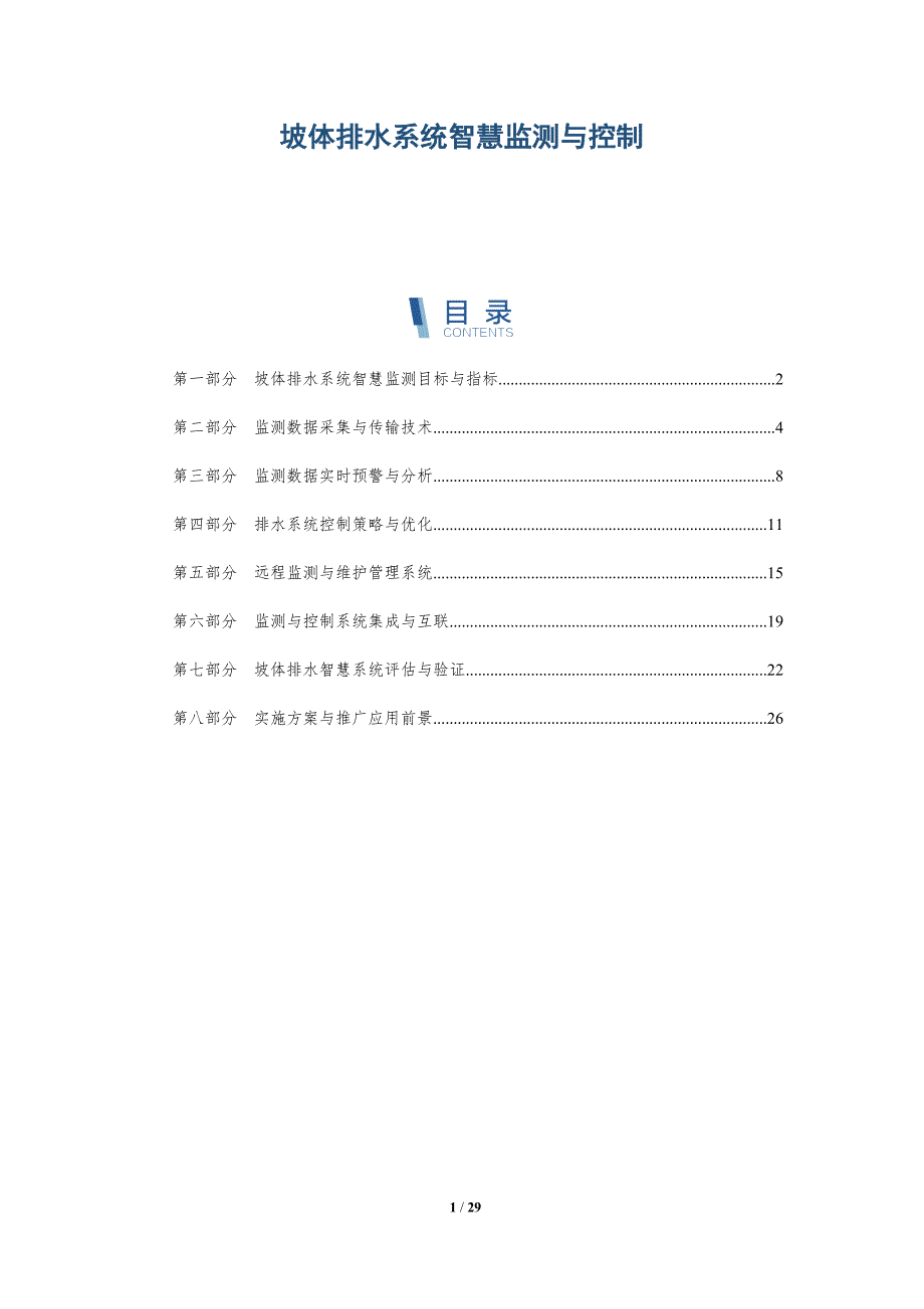 坡体排水系统智慧监测与控制 第一部分 坡体排水系统智慧监测目标与指标 2第二部分 监测数据采集与传输技术 4第三部分 监测数据实时预警与分析 8第四部分 排水系统控制策略与优化 11第五部分 远程监测与维护管理系统 15第六部分 监测与控制系统集成与互联 19第七部分 坡体排水智慧系统评估与验证 22第八部分 实施方案与推广应用前景 26第一部分 坡体排水系统智慧监测目标与指标关键词关键要点主题名称:实时数据采集与处理1. 利用物联网(IoT)技术,实时采集坡体排水系统中的传感器数据(如渗透压、水位、流速等)2. 运用云计算和边缘计算,对采集的数据进行预处理、过滤和存储,确保数据质量和安全性3. 采用数据挖掘算法和机器学习模型,对数据进行分析处理,提取有价值的信息和趋势主题名称:风险预警与判定坡体排水系统智慧监测目标与指标1. 实时监测目标* 实时获取坡体排水系统各关键点的流量、水位、沉降、渗压等数据 及时发现排水系统异常或潜在风险,并发出预警信号 为运行人员提供实时决策支持,及时采取应对方案2. 数据指标* 流量监测: * 流量范围:0~1000 L/s * 精度:±5% * 采样频率:1 Hz* 水位监测: * 水位范围:0~5 m * 精度:±1 cm * 采样频率:1 Hz* 沉降监测: * 沉降量范围:0~100 mm * 精度:±0.1 mm * 采样频率:1 min* 渗压监测: * 渗压力范围:0~100 kPa * 精度:±2 kPa * 采样频率:1 min3. 监测内容3.1 排水管网监测* 流量、水位* 管道沉降、变形* 渗漏检测3.2 边坡监测* 孔隙水压力、土体含水量* 地表沉降、位移* 雨量、渗流3.3 泵站监测* 水泵运行状态、流量* 液位、压力* 电能消耗4. 预警指标* 流量异常:流量超过或低于设定阈值* 水位异常:水位超过或低于设定阈值* 沉降超速:沉降量超过设定速率* 渗压超标:渗压力超过设定阈值* 雨量阈值:超过设定雨量阈值时,预警系统发出高风险预警5. 评估指标* 监测覆盖率:智慧监测系统覆盖的监测点数量占总监测点数量的百分比* 数据准确性:监测数据与实际情况的符合程度,误差范围应符合规范要求* 预警灵敏度:监测系统及时发现异常情况并发出预警信号的能力* 预警正确率:预警系统发出的预警信号与实际情况相符的百分比* 监测时效性:监测数据传输、处理和预警响应的时延第二部分 监测数据采集与传输技术关键词关键要点传感器技术1. 传统传感器技术:应变式、压电式和光纤式传感器等,可监测坡体位移、变形等参数,但响应速度慢、抗干扰性低。
