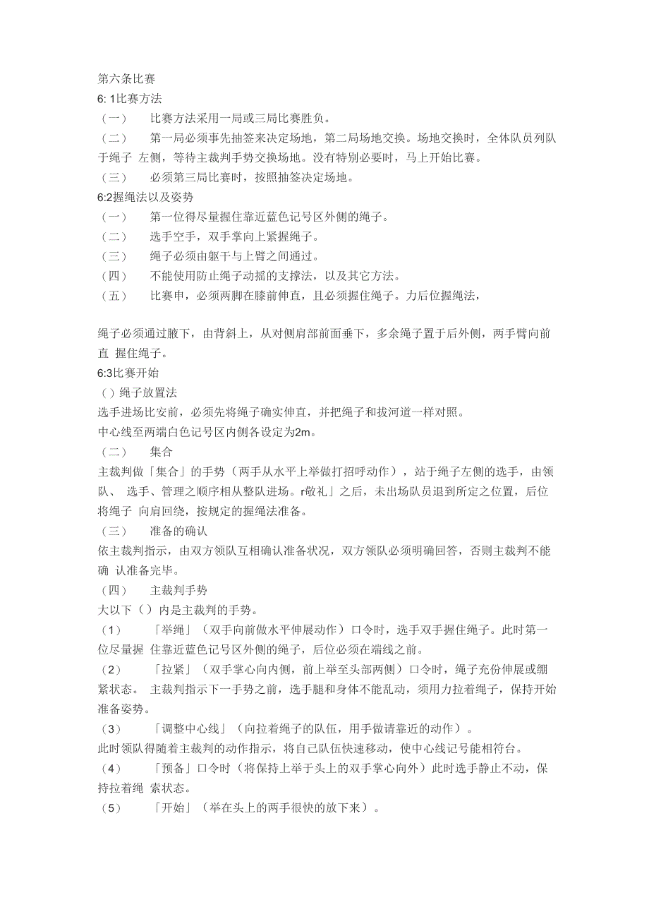 四) 主裁判手势大以下()内是主裁判的手势1) 「举绳」(双手向前做水平伸展动作)口令时,选手双手握住绳子此时第一位尽量握 住靠近蓝色记号区外侧的绳子,后位必须在端线之前2) 「拉紧」(双手掌心向内侧,前上举至头部两侧)口令时,绳子充份伸展或绷紧状态 主裁判指示下一手势之前,选手腿和身体不能乱动,须用力拉着绳子,保持开始准备姿势3) 「调整中心线」(向拉着绳子的队伍,用手做请靠近的动作)此时领队得随着主裁判的动作指示,将自己队伍快速移动,使中心线记号能相符台4) 「预备」口令时(将保持上举于头上的双手掌心向外)此时选手静止不动,保持拉着绳 索状态5) 「开始」(举在头上的两手很快的放下来)6:4比赛结束(一) 每一局胜负判定:本队绳子的白色记号区,被拉到最远方的2m线,则绳子移动4m为胜负之判定不限制时 间,一直到能判断胜负为止二) 主裁判判为违反规则,并被宣告失格退场的比安队伍,算此局比赛失败(一局比赛时, 这场比赛失败)三) 主裁判可视危险程度,宣判在进行中的比赛中断,并以绳子中心记号区的位置判定胜负 尤其是小学生及高龄者的比赛,如时间太长,运动太激烈产生过度疲劳时,主裁判可视当时 情况,以中心记号区位置为判定胜负之根据。