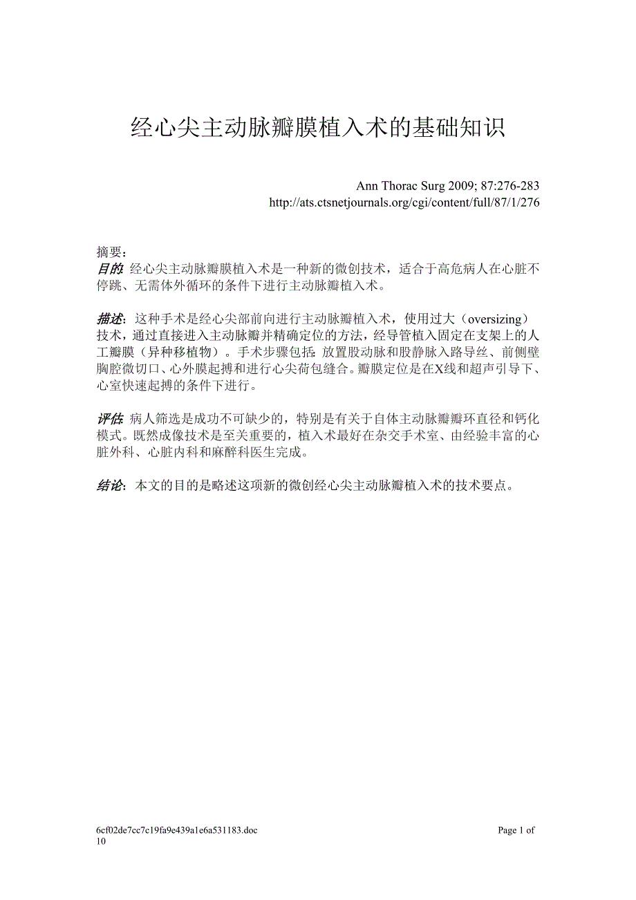 经心尖主动脉瓣膜植入术的基础知识Ann Thorac Surg 2009; 87:276-283http://ats.ctsnetjournals.org/cgi/content/full/87/1/276摘要:目的:经心尖主动脉瓣膜植入术是一种新的微创技术,适合于高危病人在心脏不停跳、无需体外循环的条件下进行主动脉瓣植入术描述:这种手术是经心尖部前向进行主动脉瓣植入术,使用过大(oversizing)技术,通过直接进入主动脉瓣并精确定位的方法,经导管植入固定在支架上的人工瓣膜(异种移植物)手术步骤包括:放置股动脉和股静脉入路导丝、前侧壁胸腔微切口、心外膜起搏和进行心尖荷包缝合瓣膜定位是在X线和超声引导下、心室快速起搏的条件下进行评估:病人筛选是成功不可缺少的,特别是有关于自体主动脉瓣瓣环直径和钙化模式既然成像技术是至关重要的,植入术最好在杂交手术室、由经验丰富的心脏外科、心脏内科和麻醉科医生完成结论:本文的目的是略述这项新的微创经心尖主动脉瓣植入术的技术要点1 技术经心尖主动脉瓣植入术(TAAVI)是一种治疗主动脉瓣狭窄的、微创的、无需体外循环的技术手术过程包括以左前侧壁胸腔小切口作为左室心尖部直接前向植入术的入路,随后经导管植入人工主动脉瓣。
