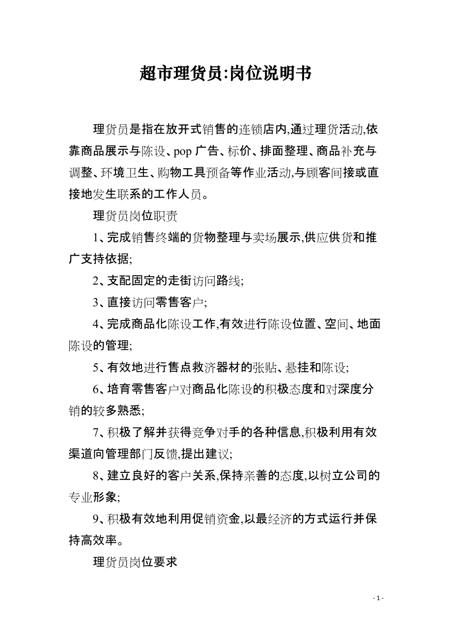 超市理货员:岗位说明书 理货员是指在放开式销售的连锁店内,通过理货活动,依靠商品展示与陈设、pop广告、标价、排面整理、商品补充与调整、环境卫生、购物工具预备等作业活动,与顾客间接或直接地发生联系的工作人员 理货员岗位职责 1、完成销售终端的货物整理与卖场展示,供应供货和推广支持依据; 2、支配固定的走街访问路线; 3、直接访问零售客户; 4、完成商品化陈设工作,有效进行陈设位置、空间、地面陈设的管理; 5、有效地进行售点救济器材的张贴、悬挂和陈设; 6、培育零售客户对商品化陈设的积极态度和对深度分销的较多熟悉; 7、积极了解并获得竞争对手的各种信息,积极利用有效渠道向管理部门反馈,提出建议; 8、建立良好的客户关系,保持亲善的态度,以树立公司的专业形象; 9、积极有效地利用促销资金,以最经济的方式运行并保持高效率 理货员岗位要求 1、市场营销或相关专业; 2、熟识市场营销、管理、财务学问、产品学问、市场生动化与卖场展示等方面的学问; 3、能够协助业务代表进行销售工作; 4、具有一定的销售理论学问; 5、具有一定的人际交往能力和沟通能力; 6、具有较强的应变能力和学习能力; 7、富有激情,团队意识强,擅长与人合作; 8、敬业,富有奉献精神; 9、乐观进取,勤奋务实,情愿尝试挑战性工作。