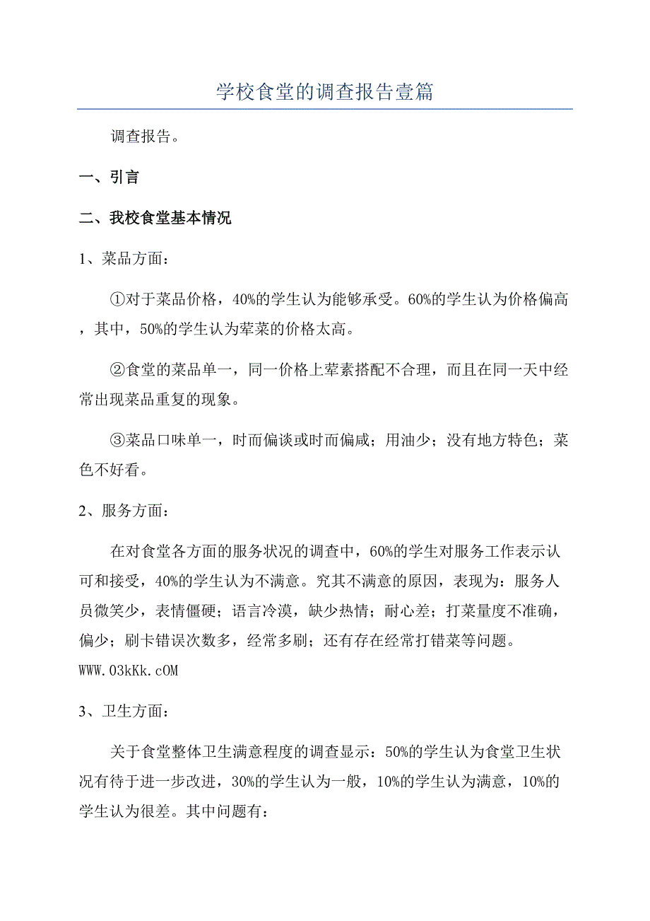食堂是学生集中就餐的地方食堂饭菜质量卫生的好坏直接关系到学生的身体健康良好的就餐环境有助于愉快地饮食,更好地学习我们热切希望学校有关监管部门加强对食堂工作的监管,也希望同学们积极配合食堂工作人员的工作我们相信在全校师生及食堂工作人员的共同努力下,一个饭菜价格公道合理,卫生质量符合要求,就餐环境轻松愉快的新食堂将展现在大家面前!四、总结食堂整体情况为一般或不理想,存在部分不足体现为分量少,菜品单一,服务不尽人意,口味及营养方面有所欠缺等一个好的食堂该是让大家在学习生活中轻松愉悦的场所,食堂只有不断改进质量和服务才能使得学生的生活更美好以下是我们针对本次调查结果整理并分析后,对本校食堂及相关部门提出的几点建议和意见:1、定期征集同学们最喜爱的菜,菜品定期更新2、扩大规模增设窗口,消毒餐具,提高服务质量,增加饭菜分量3、色彩鲜艳以促进食欲4、天天有个别优惠菜,吸引顾客5、增加保洁员,定期大清洁,餐具消毒透明化等方式以保证食堂的卫生,让大家吃得放心、安心6、对饭菜的各种营养元素进行合理搭配后出售或推出营养合理搭配的套餐前的事情了还有一一、调查简介随着生活水平的提高,食品市场的安全问题已引起了人们越来越多的关注,从食品的包装到食品的贮藏,各环节都开始进入到人们的视线当中。