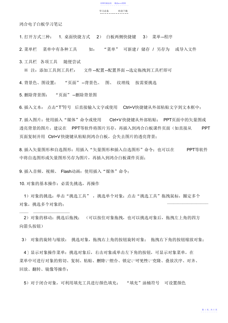 名师归纳总结 精品word资料 - - - - - - - - - - - - - - -学习必备 欢迎下载鸿合电子白板学习笔记1. 打开方式三种: 1. 桌面快捷方式 2) 白板两侧快捷键 3) 菜单--程序2. 菜单栏 菜单中有各种工具 如: “菜单” 可新建 / 储存 / 另存为 或导入文件3. 工具栏 各项工具 随便尝试※ 注:添加工具到工具栏: 文件--配置--配置界面 --选定拖拽到工具栏即可4. 背景色、图设置: “页面” --背景色、 图、 纹理线 按需要挑选5. 删除背景图: “页面” --删除背景图6. 插入文本: 点击“T”符号 后直接输入文字或使用 Ctrl+V快捷键从外部粘贴文字到文本框中;7. 插入图片:使用插入“媒体”命令或使用 Ctrl+V 快捷键从外部粘贴; PPT页面中的矢量图或透亮背景的图片,建议在 PPT等软件将图片另存,再插入到鸿合白板课件页面(如直接从 PPT 页面复制并用 Ctrl+V 快捷键从粘贴到鸿合白板,会失去图片的透亮背景;8. 插入矢量图形和自选图形:用插入“矢量图形和插入自选图形”命令;也可以在 PPT等软件中将自选图形或矢量图形另存为图片,再插入到鸿合白板课件页面;9. 插入音频、视频、 Flash动画:使用插入“媒体”命令;10. 对象的基本操作:必需先挑选,再操作1)对象的挑选:单击“挑选工具” ,挑选单个对象;点击“挑选工具”拖拽鼠标,圈定多个对象,挑选多个对象的;2)对象的移动:挑选后拖拽; (可以按住对象拖拽,也可以挑选对象后,拖拽左上角的四方向箭头按钮)3) 对象的旋转与缩放: 挑选对象,拖拽右上角的按钮旋转对象; 拖拽右下角的按钮缩放对象;4〕显示对象操作菜单:挑选对象后,右击对象或单击左下角的按钮,可显示对象菜单,在菜单中可进行对象的剪切、复制、粘贴、删除、组合、锁定、可见性、克隆、叠放次序、对齐、回放、翻转、镜像等操作;5)对于闭合对象,可利用填充工具进行颜色填充; “填充”油桶符号 可设置颜色 第 1 页,共 5 页 - - - - - - - - -名师归纳总结 精品word资料 - - - - - - - - - - - - - - -学习必备 欢迎下载6)对象的编辑:选中可以编辑的文字对象时,可以单击显现的编辑按钮(左下角) “T”符号对文字进行编辑;11. 页面放映工具(右下角△符号) 前一个按钮是“从头开头放映” ,其次个按钮是“从当前页开头放映”12. 云平台资源面板(右上角云朵符号)打开云平台资源面板,点击“推送” ,然后点击“资源推送”;在显现在对话框中挑选学科、 年级、教材、单元后,进一步挑选课程章节, 点击“完成” 按钮;如需要插入其它章节内容, 就章节栏如:“第一节 多变的天气”,然后可以挑选其它章节;13. 功能面板 (左边△符号)1 )索引栏: 对页面进行剪切、复制、粘贴、删除、位置调整等操作2 )属性浏览器:页显示选定对象的具体信息 可修改;3 )学科 ; 生物、化学、地理、语文、英语、数学、音乐、物理等学科应用工具;4 )页面模板:拖拽进去 更换页面风格5 ) 特效交互(即 ppt 的自定义动画):将对象分别拖拽至“触发对象”和“结果对象”中时,会显现双弯箭头图标,此时松开鼠标,将对象拖拽至“结果对象”的下方,会显现“ +”外形的图标 , 此时松开鼠标,就是添加新的结果对象;交互动作中,仍可设置“打开文件” 、“打开网页”、“转到其他页面” 等交互动作; 类似于 PowerPoint 软件中的“动作”和“超链接” 功能;利用好这些功能,可以实现链接到网页和文件、页面跳转等操作;14. 圆盘工具 ---最小化工具栏按钮 ---最小化按钮 ---退出授课按钮 --(屏幕批注环境下)鼠标按钮15. 圆盘“笑脸”页:自定义的工具按钮;点击“工具箱”按钮,将挑选的工具拖动到圆盘中即可;也可将工具箱中的按钮拖动其他圆盘页签中,实现其他圆盘页签按钮的定制;16. ※视频实物展台:※双击桌面上的海天地影像图标,点击“视频展台”按钮进入视频展现;点击圆盘中间的叉,可以退出程序;※实物展台与 PPT课件或电子白板的切换:只需要点击展台圆盘上的“视频展台”按钮;※(在鸿合白板中可以调用展台功能:点击工具栏中的“展台”工具按钮,在页面上拖拽鼠标画出矩形,就可以在矩形区域内显示展台中的视频画面;区域下方的工具栏可以启动和停止展台、切换设备、拍照、放大缩小、开关灯、转变辨论率、全屏切换等;17. ※ 鸿合电子白板两侧 15 个快捷键;从上到下依次是:资源(可打开学科工具) 、储存、背 第 2 页,共 5 页 - - - - - - - - -名师归纳总结 精品word资料 - - - - - - - - - - - - - - -学习必备 欢迎下载景色、新建页面、上一页、下一页、笔、设置笔宽、挑选、撤销、区域删除、切换、文本框、自定义键(“文件” 菜单--“设备定制”定制该快捷键的功能) 、清页(清空当前页面内容) ;18. ※※利用 PPT课件,使用“屏幕批注”的方式上课:方法:授课模式下,点击圆盘页面 ---“屏幕批注”按钮,打开需要批注的文档(如 PPT,打 开后全屏放映);优点:使用鸿合白板的硬笔工具在课件中进行书写,进行批注;可以用圈画重点,连线、标注等;该方式的优点是,可以完全保留 PPT课件里的自定义动画成效;注: 圆盘工具栏 ----鼠标操作按钮和 PPT 翻页按钮;当需要打开文件时,可点击圆盘上的鼠 标切换到鼠标状态;留意:用“屏幕批注”的方式上课,除了可以使用 PPT课件并在 PPT课件放映时对 PPT进行批注外, 也可以使用其他类型的课件进行批注; ※ 练习操作: 使用屏幕批注的方式上课,在 PPT放映状态进行批注;19. ※将 PPT课件导入