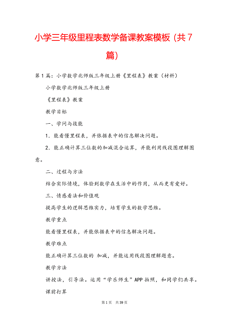 小学三年级里程表数学备课教案模板(共7篇)第1篇:小学数学北师版三年级上册《里程表》教案(材料) 小学数学北师版三年级上册 《里程表》教案 教学目标 一、学问与技能 1.能看懂里程表,并依据表中的信息解决问题 2.能正确计算三位数的加减混合运算,并能利用线段图理解图意 二、过程与方法 结合实际情境,体验到数学在生活中的作用,从而更有爱好 三、情感看法和价值观 提高学生的逻辑思维实力,培育学生的数学思维 教学重点 能看懂里程表,并能依据表中的信息解决问题 教学难点 能正确计算三位数的 加减,并能运用线段图理解题意 教学方法 讲授法,引导法运用“学乐师生”APP拍照,和同学们共享 课前打算 多媒体课件,精品练习题 课时支配 一课时 教学过程 一、导入新课 1.出示教材中的情境图,请学生观看,思索:说说这是什么事? 2.这个统计表你看懂了吗? 二、新课学习 1.你能知道周二司机叔叔行驶多少千米吗? 因为周二时, 里程表的读数事从 160 到 350 千米,所以他们的差表示的就是周二一天所行驶的路程。