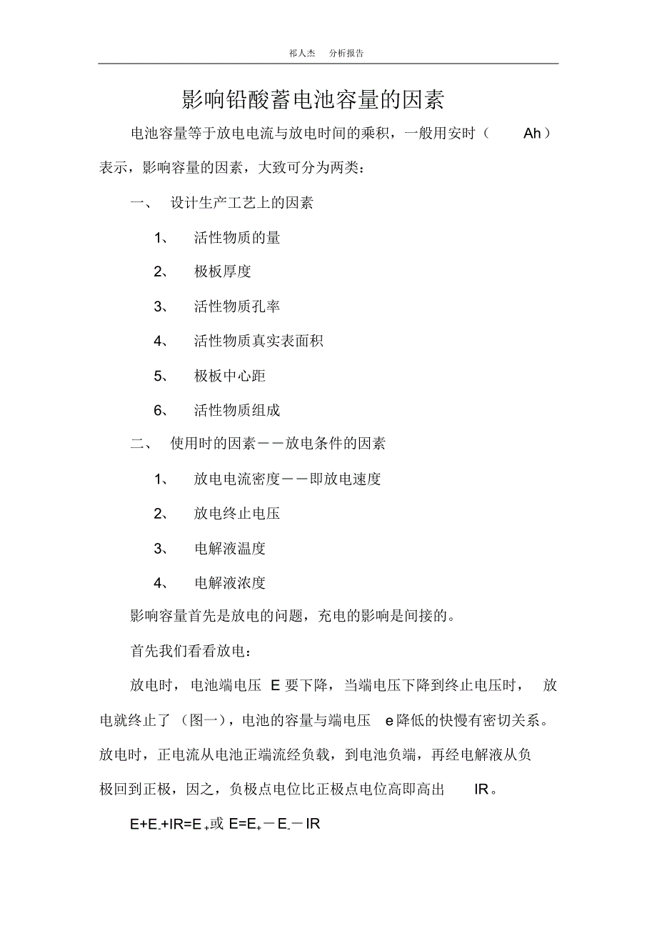 祁人杰分析报告影响铅酸蓄电池容量的因素电池容量等于放电电流与放电时间的乘积,一般用安时(Ah)表示,影响容量的因素,大致可分为两类:一、 设计生产工艺上的因素1、活性物质的量2、极板厚度3、活性物质孔率4、活性物质真实表面积5、极板中心距6、活性物质组成二、 使用时的因素――放电条件的因素1、放电电流密度――即放电速度2、放电终止电压3、电解液温度4、电解液浓度影响容量首先是放电的问题,充电的影响是间接的首先我们看看放电:放电时,电池端电压 E 要下降,当端电压下降到终止电压时,放电就终止了 (图一) ,电池的容量与端电压e降低的快慢有密切关系放电时,正电流从电池正端流经负载,到电池负端,再经电解液从负极回到正极,因之,负极点电位比正极点电位高即高出IRE+E-+IR=E+或 E=E+-E--IR 祁人杰分析报告端电压 E=(E+-E-)-IR · · · · · · · · · · · · · · (1)其中: E+为正极电位、 E-为负极电位、 I 为电流、 R 为内阻放电过程中 E+变负(即减少),E-变正(即增加),内阻 R 增大,所以端电压 E 下降放电时: PbO2+Pb+2H2SO4 2PbSO4+2H2O 从这个反应式可知, 放电时生成了不导电的PbSO4,它覆盖住活性物质的部分表面,使导电截面积减少,因而内阻R 增大。