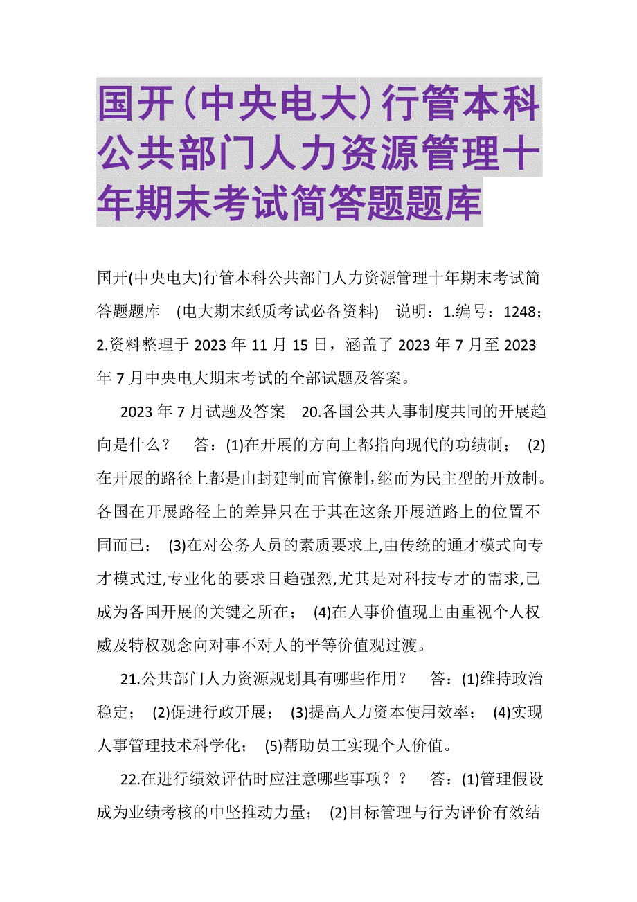 国开(中央电大)行管本科公共部门人力资源管理十年期末考试简答题题库国开(中央电大)行管本科公共部门人力资源管理十年期末考试简答题题库 (电大期末纸质考试必备资料) 说明:1.编号:1248; 2.资料整理于2023年11月15日,涵盖了2023年7月至2023年7月中央电大期末考试的全部试题及答案 2023年7月试题及答案 20.各国公共人事制度共同的开展趋向是什么? 答:(1)在开展的方向上都指向现代的功绩制; (2)在开展的路径上都是由封建制而官僚制,继而为民主型的开放制各国在开展路径上的差异只在于其在这条开展道路上的位置不同而已; (3)在对公务人员的素质要求上,由传统的通才模式向专才模式过,专业化的要求目趋强烈,尤其是对科技专才的需求,已成为各国开展的关键之所在; (4)在人事价值现上由重视个人权威及特权观念向对事不对人的平等价值观过渡 21.公共部门人力资源规划具有哪些作用? 答:(1)维持政治稳定; (2)促进行政开展; (3)提高人力资本使用效率; (4)实现人事管理技术科学化; (5)帮助员工实现个人价值 22.在进行绩效评估时应注意哪些事项?? 答:(1)管理假设成为业绩考核的中坚推动力量; (2)目标管理与行为评价有效结合起,协调好业绩评估的监誓职能与引导职能; (3)形成有效的人力资源管理机制; (4)要往意评估方法的适用性; (5)要注意评估标唯的合理性; (6)要性意评低过程的完整性。