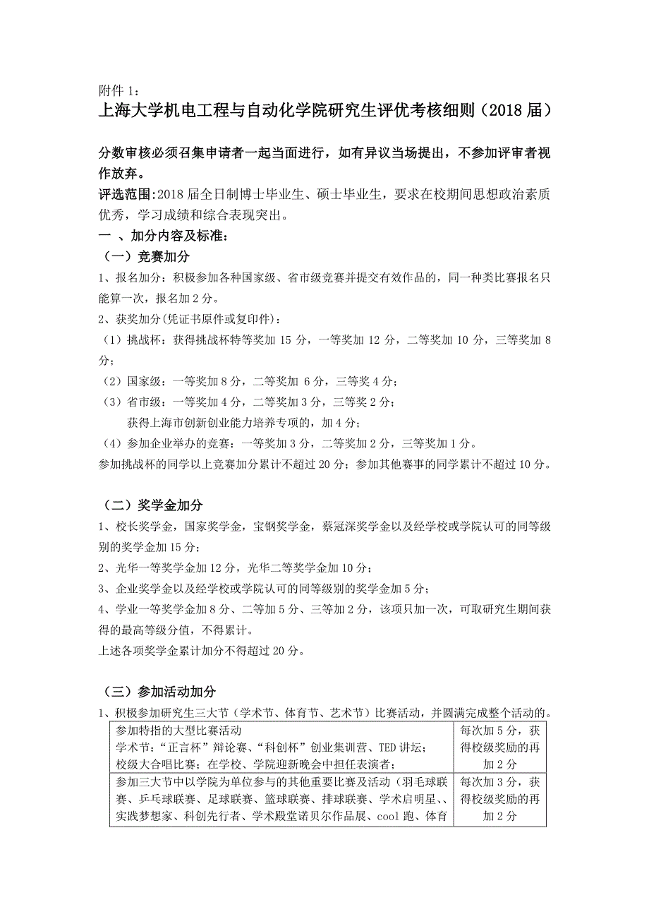 附件 1: 上海大学机电工程与自动化学院研究生评优考核细则上海大学机电工程与自动化学院研究生评优考核细则((20182018 届)届) 分数审核必须召集申请者一起当面进行,如有异议当场提出,不参加评审者视分数审核必须召集申请者一起当面进行,如有异议当场提出,不参加评审者视作放弃 评选范围评选范围: :2018 届全日制博士毕业生、硕士毕业生,要求在校期间思想政治素质优秀,学习成绩和综合表现突出 一一 、加分内容及标准:、加分内容及标准: (一)竞赛加分(一)竞赛加分 1、报名加分:积极参加各种国家级、省市级竞赛并提交有效作品的,同一种类比赛报名只能算一次,报名加 2 分 2、获奖加分(凭证书原件或复印件): (1)挑战杯:获得挑战杯特等奖加 15 分,一等奖加 12 分,二等奖加 10 分,三等奖加 8分; (2)国家级:一等奖加 8 分,二等奖加 6 分,三等奖 4 分; (3)省市级:一等奖加 4 分,二等奖加 3 分,三等奖 2 分; 获得上海市创新创业能力培养专项的,加 4 分; (4)参加企业举办的竞赛:一等奖加 3 分,二等奖加 2 分,三等奖加 1 分。
