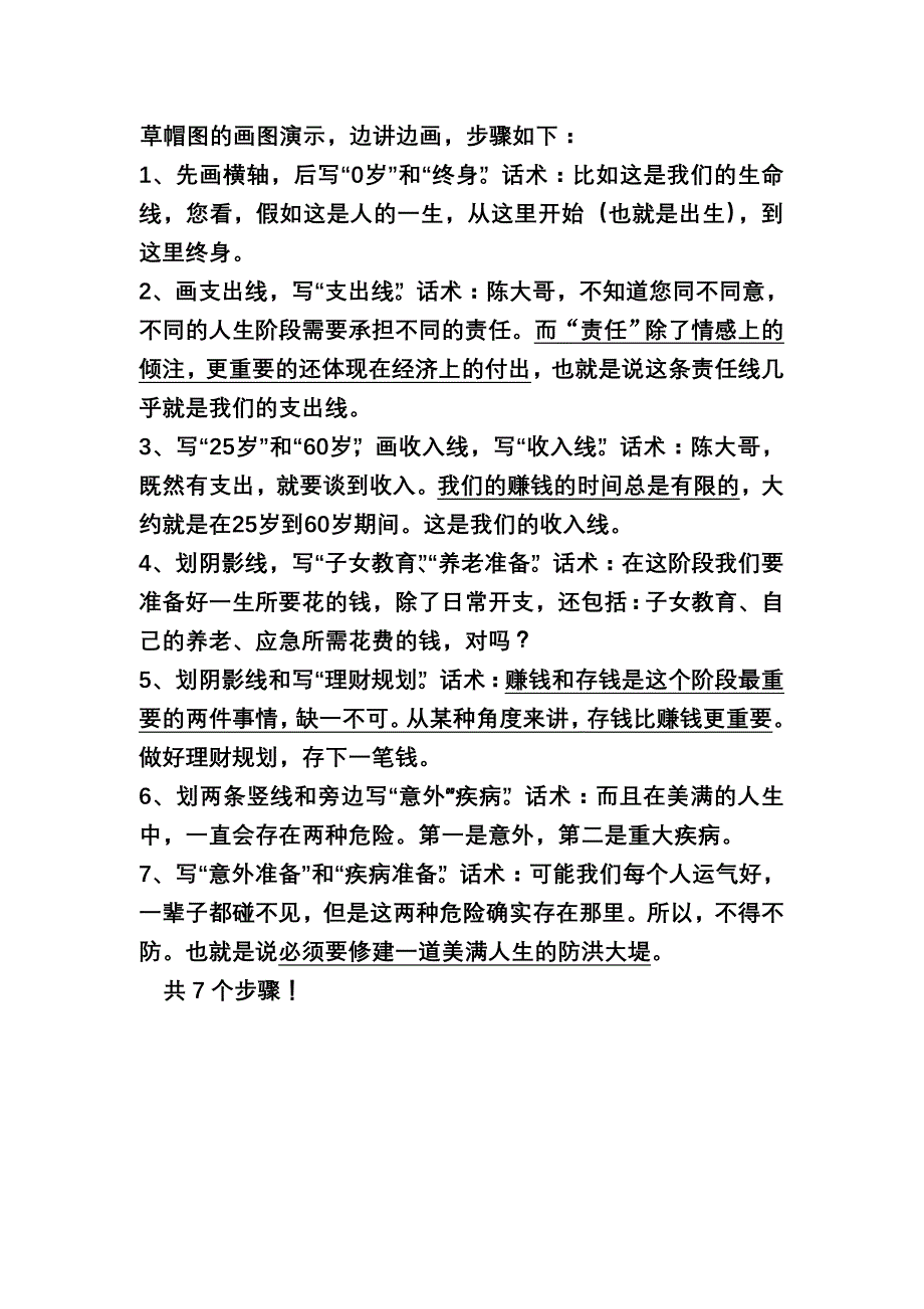 草帽图的画图演示,边讲边画,步骤如下:1、先画横轴,后写“0岁”和“终身”话术:比如这是我们的生命线,您看,假如这是人的一生,从这里开始(也就是出生),到这里终身2、画支出线,写“支出线”话术:陈大哥,不知道您同不同意,不同的人生阶段需要承担不同的责任而“责任”除了情感上的倾注,更重要的还体现在经济上的付出,也就是说这条责任线几乎就是我们的支出线3、写“25岁”和“60岁”,画收入线,写“收入线”话术:陈大哥,既然有支出,就要谈到收入我们的赚钱的时间总是有限的,大约就是在25岁到60岁期间这是我们的收入线4、划阴影线,写“子女教育”、“养老准备”话术:在这阶段我们要准备好一生所要花的钱,除了日常开支,还包括:子女教育、自己的养老、应急所需花费的钱,对吗?5、划阴影线和写“理财规划”话术:赚钱和存钱是这个阶段最重要的两件事情,缺一不可从某种角度来讲,存钱比赚钱更重要做好理财规划,存下一笔钱6、划两条竖线和旁边写“意外”“疾病”话术:而且在美满的人生中,一直会存在两种危险第一是意外,第二是重大疾病7、写“意外准备”和“疾病准备”话术:可能我们每个人运气好,一辈子都碰不见,但是这两种危险确实存在那里。