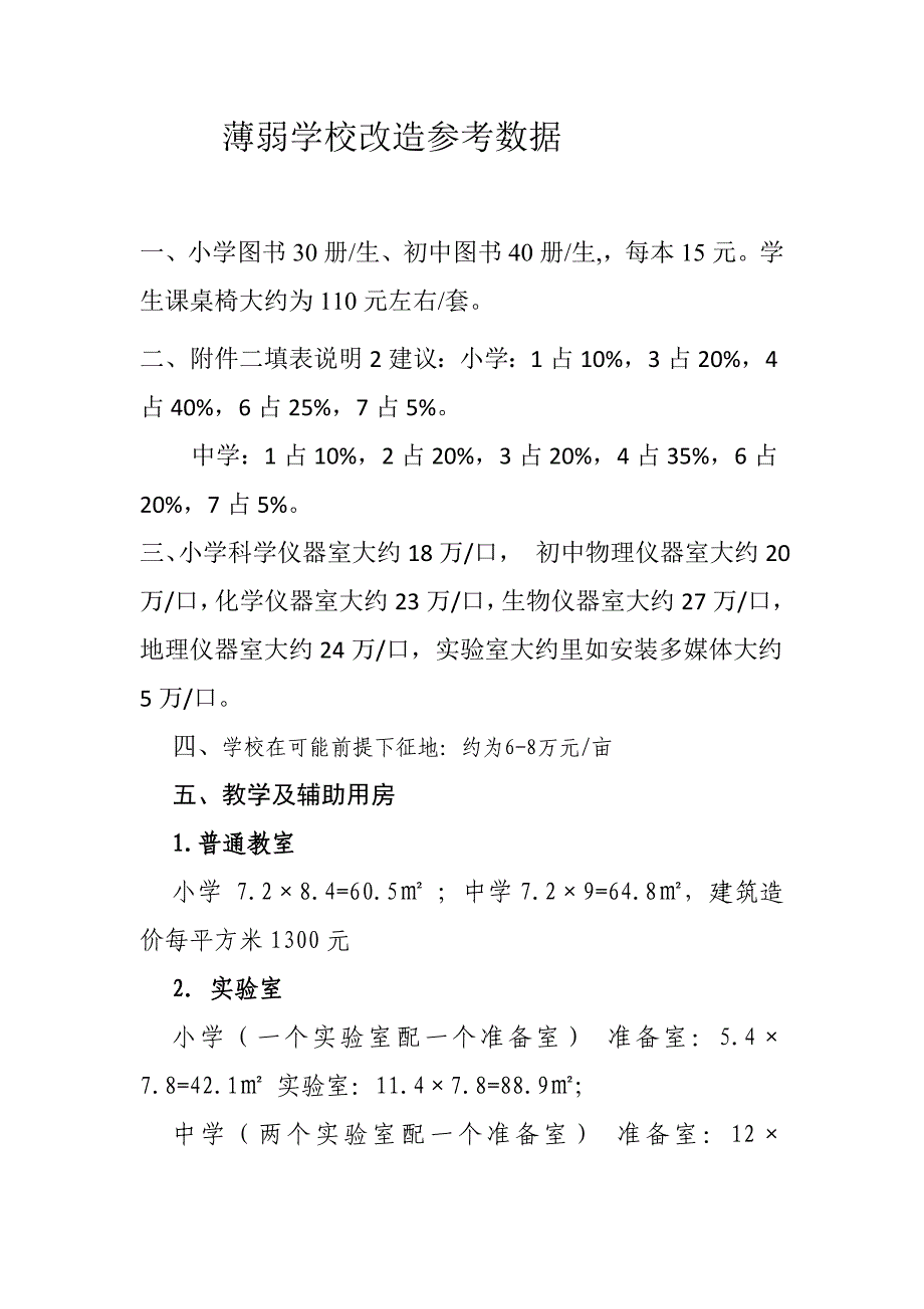 薄弱学校改造参考数据一、小学图书30册/生、初中图书40册/生,,每本15元学生课桌椅大约为110元左右/套二、附件二填表说明2建议:小学:1占10%,3占20%,4占40%,6占25%,7占5%中学:1占10%,2占20%,3占20%,4占35%,6占20%,7占5%三、小学科学仪器室大约18万/口, 初中物理仪器室大约20万/口,化学仪器室大约23万/口,生物仪器室大约27万/口,地理仪器室大约24万/口,实验室大约里如安装多媒体大约5万/口四、学校在可能前提下征地:约为6-8万元/亩五、教学及辅助用房1.普通教室小学 7.2×8.4=60.5㎡ ;中学7.2×9=64.8㎡,建筑造价每平方米1300元2.实验室小学(一个实验室配一个准备室) 准备室:5.4×7.8=42.1㎡ 实验室:11.4×7.8=88.9㎡;中学(两个实验室配一个准备室) 准备室:12×8.4=100.8㎡ 实验室:11.4×7.8=88.9㎡建筑造价:每平方米1500元3.图书室图书室面积无要求,阅览室 小学生均1.8㎡,初中生均1.9㎡,教师人均2.3㎡建筑造价:每平方米1500元4.计算机室小学、中学:12×8.4=100.8㎡。