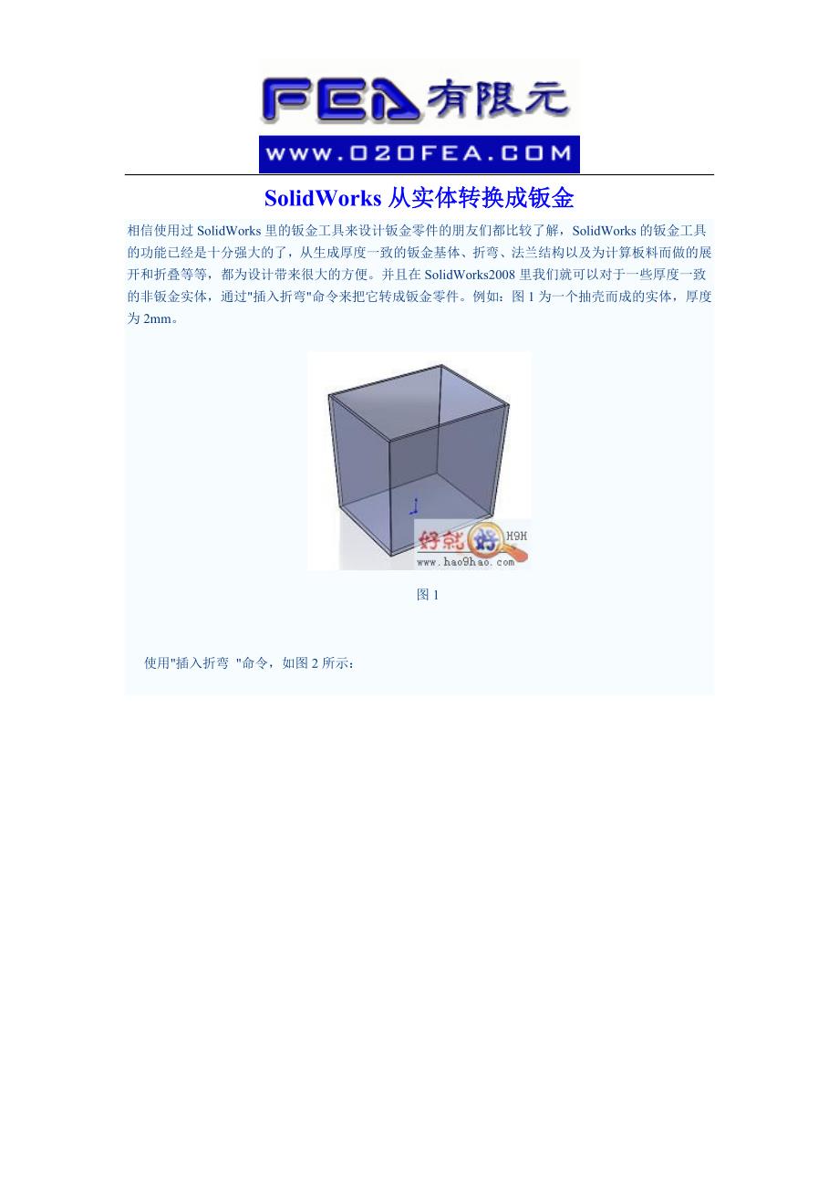 SolidWorks从实体转换成钣金相信使用过SolidWorks里的钣金工具来设计钣金零件的朋友们都比较了解,SolidWorks的钣金工具的功能已经是十分强大的了,从生成厚度一致的钣金基体、折弯、法兰结构以及为计算板料而做的展开和折叠等等,都为设计带来很大的方便并且在SolidWorks2008里我们就可以对于一些厚度一致的非钣金实体,通过"插入折弯"命令来把它转成钣金零件例如:图1为一个抽壳而成的实体,厚度为2mm 图1 使用"插入折弯 "命令,如图2所示: 图2 根据左边的编辑器的设定,设置折弯的参数,选定固定面、切口边线和释放槽,就可以得到如图3的钣金零件 图3-1生成钣金零件 图3-2展开视图 对于本身厚度就是一致的实体我们可以通过这个方法来进行从实体到钣金的转化,现在请看看一下这个钣金零件,如图4所示: 图4 这个零件的结构并不复杂,我们可以通过使用一连串的"折弯 "也可以完成,但如图5所示,我们需要绘制10条折弯线来实现,显然不是很方便 图5 10条折弯线 这时候,设计者们就会提出:我先以实体的形式把钣金的最终形状大概画出来,然后把它转换成钣金,这样就方便得多了。