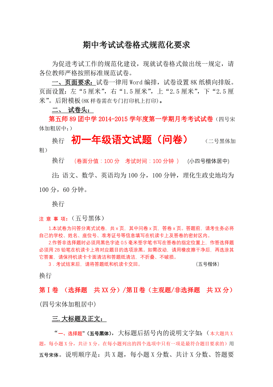 期中考试试卷格式规范化要求 为促进考试工作的规范化建设,现就试卷格式做出统一规定,请各位教师严格按照标准规范试卷一、页面要求:试卷一律用Word编排,试卷设置8K纸横向排版页面设置:左“5厘米”,右 “1.5厘米”,上“2.5厘米”,下“2.5厘米”后附模板(8K样卷需在专门打印机上打印)二、 试卷头: 第五师89团中学2014-2015学年度第一学期月考考试试卷(四号宋体加粗居中;)换行 初一年级语文试题(问卷) (二号黑体加粗)换行 (卷面分值:100分 考试时间:100分钟 ) (小四号楷体居中)注:语文、数学、英语均为100分,100分钟,理化生政史地均为100分,60分钟换行注 意 事 项:(五号黑体)1.本试卷为问答分离式试卷,共x页,其中问卷x页,答卷x页答题前,请考生务必将自己的学校、姓名、座位号、准考证号等信息填写在机读卡上及答卷的密封区内2.作答非选择题时必须用黑色字迹0.5毫米签字笔书写在答卷的指定位置上,作答选择题必须用2B铅笔在机读卡上将对应题目的选项涂黑如需改动,请用橡皮擦干净后,再选涂其它答案,请保持机读卡卡面清洁和答题纸清洁,不折叠、不破损 3.考试结束后,请将答题纸和机读卡交回。