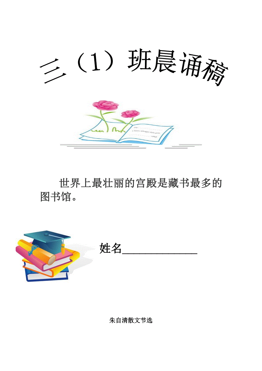 世界上最壮丽的宫殿是藏书最多的图书馆姓名_____________朱自清散文节选1、“吹面不寒杨柳风”,不错的,像母亲的手抚摸着你风里带来些新翻的泥土的气息,混着青草味儿,还有各种花的香,都在微微润湿的空气里酝酿鸟儿将巢安在繁花嫩叶当中,高兴起来了,呼朋引伴地卖弄清脆的喉咙,唱出宛转的曲子,跟轻风流水应和着牛背上牧童的短笛,这时候也成天嘹亮地响着雨是最寻常的,一下就是三两天看,像牛毛,像花针,像细丝,密密地斜织着,人家屋顶上全笼着一层薄烟树叶儿却绿得发亮小草儿也青得逼你的眼傍晚时候,上灯了,一点点黄晕的光,烘托出一片安静而和平的夜在乡下,小路上,石桥边,有撑着伞慢慢走着的人;地里还有工作的农民,披着蓑戴着笠他们的房屋,稀稀疏疏的,在雨里静默着《春》 2、 曲曲折折的荷塘上面,弥望的是田田的叶子叶子出水很高,像亭亭的舞女的裙层层的叶子中间,零星地点缀着些白花,有袅娜地开着,有羞涩的打着朵儿的;正如一粒粒的明珠,又如碧天里的星星,又如刚出浴的美人微风过处,送来缕缕清香,仿佛远处高楼上渺茫的歌声似的这时候叶子与花也有一些的颤动,像闪电般,霎时传过荷塘的那边去了叶子本是肩并肩密密的挨着,这便宛然有了一道凝碧的波痕。