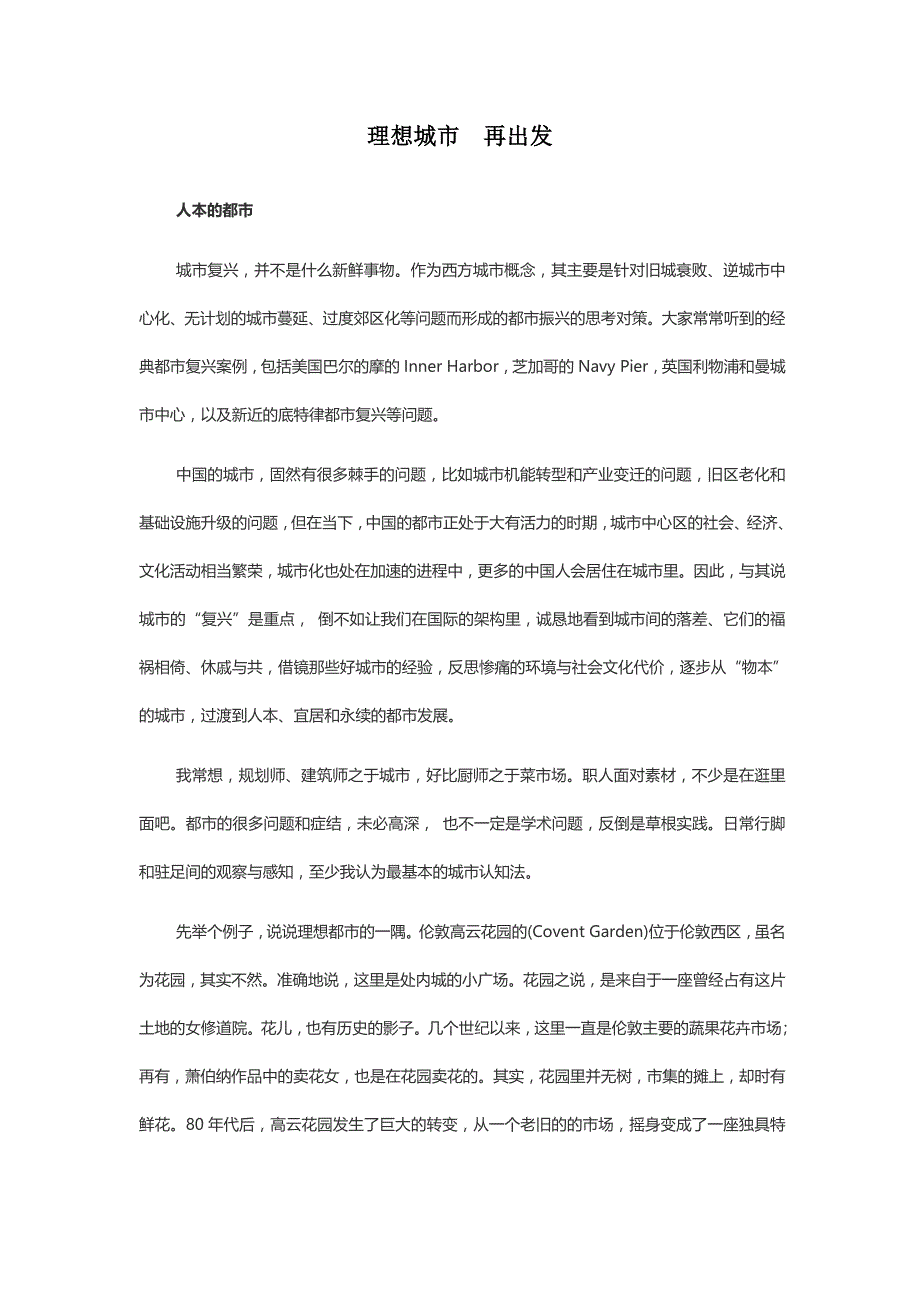 理想城市理想城市 再出发再出发人本的都市 城市复兴,并不是什么新鲜事物作为西方城市概念,其主要是针对旧城衰败、逆城市中心化、无计划的城市蔓延、过度郊区化等问题而形成的都市振兴的思考对策大家常常听到的经典都市复兴案例,包括美国巴尔的摩的 Inner Harbor,芝加哥的 Navy Pier,英国利物浦和曼城市中心,以及新近的底特律都市复兴等问题 中国的城市,固然有很多棘手的问题,比如城市机能转型和产业变迁的问题,旧区老化和基础设施升级的问题,但在当下,中国的都市正处于大有活力的时期,城市中心区的社会、经济、文化活动相当繁荣,城市化也处在加速的进程中,更多的中国人会居住在城市里因此,与其说城市的“复兴”是重点, 倒不如让我们在国际的架构里,诚恳地看到城市间的落差、它们的福祸相倚、休戚与共,借镜那些好城市的经验,反思惨痛的环境与社会文化代价,逐步从“物本”的城市,过渡到人本、宜居和永续的都市发展 我常想,规划师、建筑师之于城市,好比厨师之于菜市场职人面对素材,不少是在逛里面吧都市的很多问题和症结,未必高深, 也不一定是学术问题,反倒是草根实践日常行脚和驻足间的观察与感知,至少我认为最基本的城市认知法。