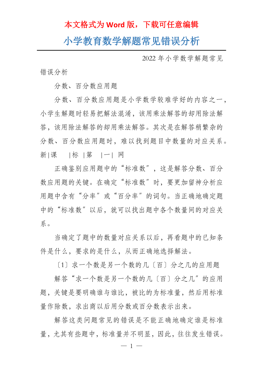 本文格式为Word版,下载可任意编辑小学教育数学解题常见错误分析 2022年小学数学解题常见错误分析 分数、百分数应用题 分数、百分数应用题是小学数学较难学好的内容之一,小学生解题时轻易把解法混淆,该用乘法解答的却用除法解答,该用除法解答的却用乘法解答其次是在解答稍繁杂的分数、百分数应用题时,难以找到题目中数量的对应关系新|课 |标 |第 |一| 网 正确鉴别应用题中的“标准数〞,这是解答分数、百分数应用题的关键在确定“标准数〞时,要更加留神分析应用题中含有“分率〞或“百分率〞的词句当正确地确定题中的“标准数〞以后,就可以找出题中各个数量间的对应关系 当确定了题中的数量对应关系以后,再看题中的已知条件是什么,要求的是什么,从而正确地选择解法 〔1〕求一个数是另一个数的几〔百〕分之几的应用题 解答“求一个数是另一个数的几〔百〕分之几〞的应用题,关键是要明确谁与谁比,被比的为标准量,然后用标准量作除数,求出商以后用分数或百分数表示出来 解答这类问题常见的错误是不能正确地确定谁是标准量,尤其有些题中,标准量并不明显,因此,往往发生错误。