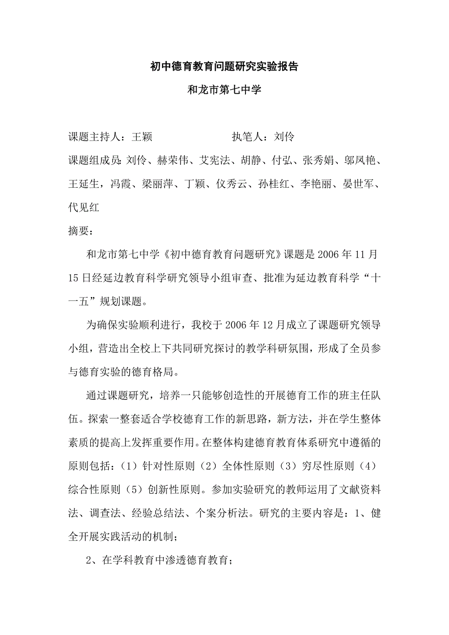 初中德育教育问题研究实验报告和龙市第七中学课题主持人:王颖 执笔人:刘伶课题组成员:刘伶、赫荣伟、艾宪法、胡静、付弘、张秀娟、邬凤艳、王延生,冯霞、梁丽萍、丁颖、仪秀云、孙桂红、李艳丽、晏世军、代见红摘要:和龙市第七中学《初中德育教育问题研究》课题是2006年11月15日经延边教育科学研究领导小组审查、批准为延边教育科学“十一五”规划课题为确保实验顺利进行,我校于2006年12月成立了课题研究领导小组,营造出全校上下共同研究探讨的教学科研氛围,形成了全员参与德育实验的德育格局通过课题研究,培养一只能够创造性的开展德育工作的班主任队伍探索一整套适合学校德育工作的新思路,新方法,并在学生整体素质的提高上发挥重要作用在整体构建德育教育体系研究中遵循的原则包括:(1)针对性原则(2)全体性原则(3)穷尽性原则(4)综合性原则(5)创新性原则参加实验研究的教师运用了文献资料法、调查法、经验总结法、个案分析法研究的主要内容是:1、健全开展实践活动的机制;2、在学科教育中渗透德育教育;3、注重开展专题性的实践活动,让学生体验中获得感受与教育;4、开拓创新,努力探索未成年人思想道德教育的新评价。