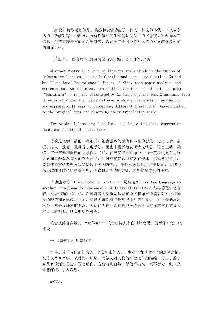 〔摘 要〕 诗歌是融信息、美感和表情功能于一体的一种文学体裁本文以奈达的“功能对等”为向导,分析许渊冲先生和翁显良先生的《静夜思》两译本在信息、美感和表情方面的功能对等,旨在洞察不同译者对原诗的不同解读及他们的翻译风格 〔关键词〕 信息功能;美感功能;表情功能;功能对等;评析 Abstract:Poetry is a kind of literary style which is the fusion of informative function, aesthetic function and expressive function. Guided by “Functional Equivalence” Theory of Nide,this paper analyses and comments on two different translation versions of Li Bai’s poem “Nostalgia”,which are translated by Xu Yuanchong and Weng Xianliang, from three aspects i.e. the functional equivalence in information, aesthetics and expression.It aims at perceiving different traslators’ understanding to the original poem and observing their translation style. Key words: informative function; aesthetic function;expressive function;functional equivalence 诗歌是文学作品的一种形式,饱含强烈的感情和丰富的想象,运用比喻、象征、拟人、反复、重叠等表现手法,更集中概括地表现诗人情思,语言生动、凝练,富于节奏和韵律的文学作品〔1〕。