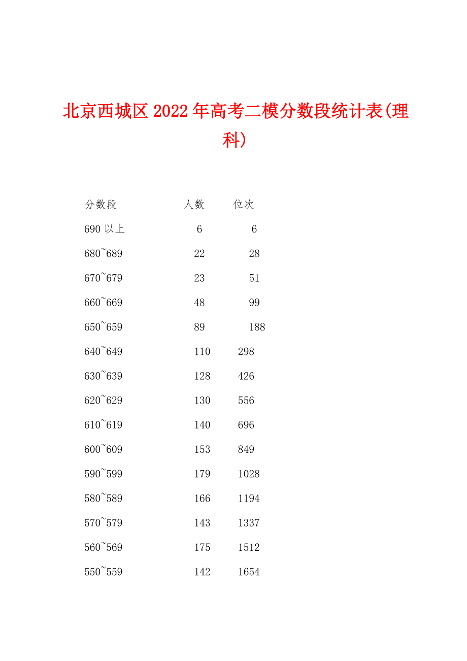 北京西城区2022年二模分数段统计表(理科) 分数段 人数 位次 690以上 6 6 680~689 22 28 670~679 23 51 660~669 48 99 650~659 89 188 640~649 110 298 630~639 128 426 620~629 130 556 610~619 140 696 600~609 153 849 590~599 179 1028 580~589 166 1194 570~579 143 1337 560~569 175 1512 550~559 142 1654 540~549 133 1787 530~539 133 1920 520~529 141 2061 510~519 136 2197 500~509 111 2308 490~499 124 2432 480~489 108 2540 470~479 76 2616 460~469 91 2707 450~459 74 2781 440~449 86 2867 430~439 69 2936 420~429 56 2992 410~419 56 3048 400~409 71 3119 390~399 49 3168 380~389 44 3212 370~379 44 3256 360~369 27 3259 359以下 3520 报考资格线 文科 理科 一本:510 510 二本:460 460。