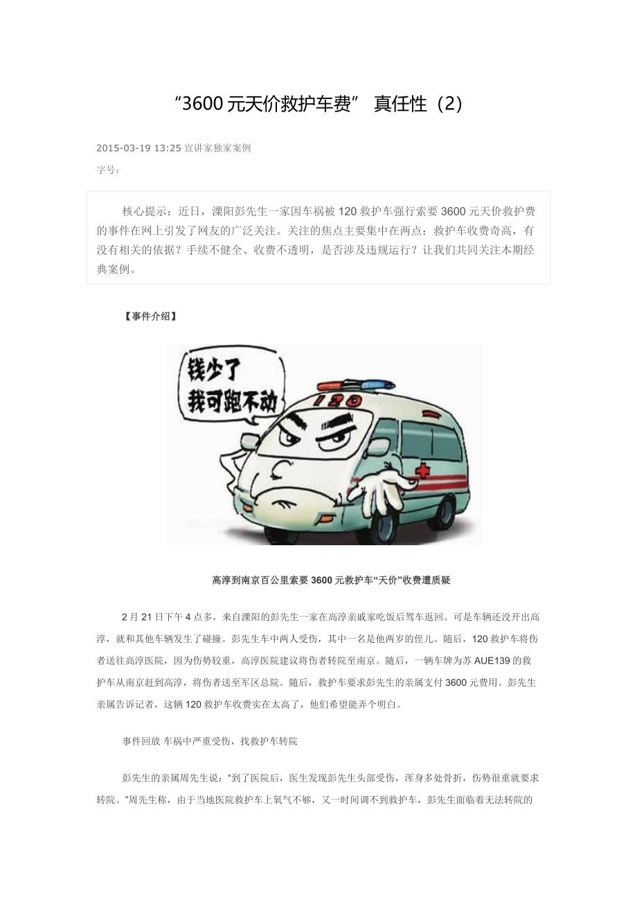 3600元天价救护车费” 真任性(2)2015-03-19 13:25 宣讲家独家案例 我要评论0 字号:核心提示:近日,溧阳彭先生一家因车祸被120救护车强行索要3600元天价救护费的事件在网上引发了网友的广泛关注关注的焦点主要集中在两点:救护车收费奇高,有没有相关的依据?手续不健全、收费不透明,是否涉及违规运行?让我们共同关注本期经典案例事件介绍】高淳到南京百公里索要3600元救护车“天价”收费遭质疑2月21日下午4点多,来自溧阳的彭先生一家在高淳亲戚家吃饭后驾车返回可是车辆还没开出高淳,就和其他车辆发生了碰撞彭先生车中两人受伤,其中一名是他两岁的侄儿随后,120救护车将伤者送往高淳医院,因为伤势较重,高淳医院建议将伤者转院至南京随后,一辆车牌为苏AUE139的救护车从南京赶到高淳,将伤者送至军区总院随后,救护车要求彭先生的亲属支付3600元费用彭先生亲属告诉记者,这辆120救护车收费实在太高了,他们希望能弄个明白事件回放 车祸中严重受伤,找救护车转院彭先生的亲属周先生说:“到了医院后,医生发现彭先生头部受伤,浑身多处骨折,伤势很重就要求转院周先生称,由于当地医院救护车上氧气不够,又一时间调不到救护车,彭先生面临着无法转院的情况。