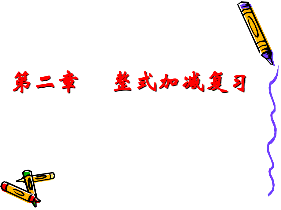 第二章第二章 整式加减复习整式加减复习知识结构:知识结构:整式的加减整式的加减整式的加减整式的加减整式的概念整式的概念整式的概念整式的概念整式的计算整式的计算整式的计算整式的计算整式的应用整式的应用整式的应用整式的应用单项式单项式单项式单项式多项式多项式多项式多项式系数系数系数系数次数次数次数次数项,项数,常数项,项数,常数项,项数,常数项,项数,常数项,最高次项项,最高次项项,最高次项项,最高次项次数次数次数次数同类项与合并同类项同类项与合并同类项同类项与合并同类项同类项与合并同类项去括号去括号去括号去括号化简求值化简求值化简求值化简求值用字母来表示生活中的量用字母来表示生活中的量用字母来表示生活中的量用字母来表示生活中的量一、基本概念中的易错题一、基本概念中的易错题1,单项式的定义,单项式的定义例例1,下列各式子中,是单项式的有,下列各式子中,是单项式的有______________(填序号)(填序号)①①、、②②、、④④、、⑦⑦注意:注意:注意:注意:1 1,单个的,单个的,单个的,单个的字母字母字母字母或或或或数字数字数字数字也是也是也是也是单项式单项式单项式单项式;;;; 2 2,用,用,用,用加减号加减号加减号加减号把数字或字母连接在一起把数字或字母连接在一起把数字或字母连接在一起把数字或字母连接在一起 的式子的式子的式子的式子不是单项式不是单项式不是单项式不是单项式;;;; 3 3,,,,只用乘号只用乘号只用乘号只用乘号把数字或字母连接在一起把数字或字母连接在一起把数字或字母连接在一起把数字或字母连接在一起 的式子仍是的式子仍是的式子仍是的式子仍是单项式单项式单项式单项式;;;; 4 4,当式子中出现,当式子中出现,当式子中出现,当式子中出现分母分母分母分母时,要留意分母里时,要留意分母里时,要留意分母里时,要留意分母里有有有有 没有字母没有字母没有字母没有字母,,,,有字母有字母有字母有字母的就的就的就的就不是单项式不是单项式不是单项式不是单项式,如,如,如,如 果果果果分母没有字母分母没有字母分母没有字母分母没有字母的仍有可能是单项式的仍有可能是单项式的仍有可能是单项式的仍有可能是单项式 (注:(注:(注:(注:“ “π π” ”当作数字,而不是字母)当作数字,而不是字母)当作数字,而不是字母)当作数字,而不是字母)2 2 2 2,单项式的系数与次数,单项式的系数与次数,单项式的系数与次数,单项式的系数与次数单项式单项式系数系数次数次数例例2 指出下列单项式的系数和次数;指出下列单项式的系数和次数;注意:注意:注意:注意:1 1,字母的,字母的,字母的,字母的系数系数系数系数“ “1 1” ” 可以省略的,但不代表可以省略的,但不代表可以省略的,但不代表可以省略的,但不代表没有系没有系没有系没有系 数数数数(次数也是同样道理);(次数也是同样道理);(次数也是同样道理);(次数也是同样道理); 2 2,,,,有分母有分母有分母有分母的单项式,的单项式,的单项式,的单项式,分母中的数字分母中的数字分母中的数字分母中的数字也是单项式系也是单项式系也是单项式系也是单项式系 数的一部分;数的一部分;数的一部分;数的一部分; 3 3,注意,注意,注意,注意“ “π” ”不是不是不是不是字母字母字母字母,而是,而是,而是,而是数字数字数字数字,,,,属于系数属于系数属于系数属于系数的一的一的一的一 部分;部分;部分;部分; 4 4,计算次数的时候并不是简单的见到指数就相,计算次数的时候并不是简单的见到指数就相,计算次数的时候并不是简单的见到指数就相,计算次数的时候并不是简单的见到指数就相 加,注意单项式的次数指的是加,注意单项式的次数指的是加,注意单项式的次数指的是加,注意单项式的次数指的是字母的指数和字母的指数和字母的指数和字母的指数和;;;;3 3 3 3,多项式的项数与次数,多项式的项数与次数,多项式的项数与次数,多项式的项数与次数例例3 下列多项式次数为下列多项式次数为3的是(的是( ))C例例例例4 4 请说出下列各多项式是几次几项式,并写出多项式的最高请说出下列各多项式是几次几项式,并写出多项式的最高请说出下列各多项式是几次几项式,并写出多项式的最高请说出下列各多项式是几次几项式,并写出多项式的最高次项和常数项;次项和常数项;次项和常数项;次项和常数项;注意注意注意注意((((1 1)多项式的次数)多项式的次数)多项式的次数)多项式的次数不是不是不是不是所有项的所有项的所有项的所有项的次数的和,而是它的最高次数的和,而是它的最高次数的和,而是它的最高次数的和,而是它的最高 次项次数次项次数次项次数次项次数;;;; ((((2 2)多项式的每一项都)多项式的每一项都)多项式的每一项都)多项式的每一项都包含包含包含包含它前面的它前面的它前面的它前面的符号符号符号符号;;;; ((((3 3)再强调一次,)再强调一次,)再强调一次,)再强调一次, “ “π π” ”当作数字,而不是字母当作数字,而不是字母当作数字,而不是字母当作数字,而不是字母4 4 4 4,书写格式中的易错点,书写格式中的易错点,书写格式中的易错点,书写格式中的易错点例例5 5 下列各个式子中,书写格式正确的是(下列各个式子中,书写格式正确的是( ))1 1、代数式中用到乘法时,若是数字与数字乘,要用、代