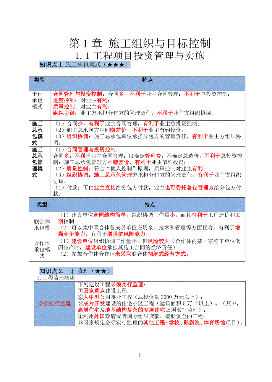 1 第 1 章 施工组织与目标控制 1.1 工程项目投资管理与实施 知识点 1知识点 1.施工承包模式()知识点 2知识点 2.工程监理()1.工程监理概述必须实行监理必须实行监理 下列建设工程必须实行监理必须实行监理:国家重点国家重点建设工程;大中型大中型公用事业工程(总投资额 3000 万元以上);成片开发成片开发建设的住宅小区工程(建筑面积 5 万 m2以上)其中,高层住宅高层住宅及地基结构复杂的多层住宅地基结构复杂的多层住宅必须实行监理);利用外国外国政府或者国际组织贷款、援助资金的工程;国家规定必须实行监理的其他工程其他工程(学校学校、影剧院影剧院、体育场馆体育场馆项目)类型类型 特点特点 平行承包模式 合同管理与投资控制合同管理与投资控制:合同多多,不利于不利于业主合同管理;不利于不利于总投资控制;进度控制进度控制:对业主有利有利;质量控制质量控制:对业主有利有利;组织协调组织协调:业主方承担分包方的管理责任,不利于不利于业主方组织协调施工施工总承总承包模包模式式(1)合同少少,有利于有利于业主合同管理,有利于有利于业主总投资控制;(2)施工总承包方中间赚差价赚差价,不利于不利于业主节约投资;(3)组织协调组织协调:施工总承包单位承担分包方的管理责任,有利于有利于业主方组织协调。