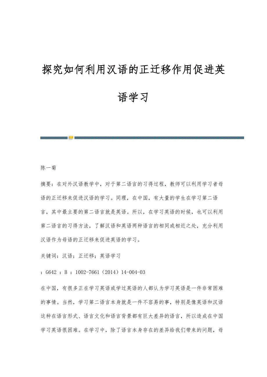 探究如何利用汉语的正迁移作用促进英语学习 陈一菊摘要:在对外汉语教学中,对于第二语言的习得过程,教师可以利用学习者母语的正迁移来促进汉语的学习同理,在中国,有大量的学生在学习第二语言,其中最主要的第二语言就是英语所以,在学习英语的时候,也可以利用第二语言的习得方法,了解汉语和英语两种语言的相同或相近之处,充分利用汉语作为母语的正迁移来促进英语的学习关键词:汉语;正迁移;英语学习:G642 :B :1002-7661(2014)14-004-03在中国,有很多正在学习英语或学过英语的人都认为学习英语是一件非常困难的事情当然,学习第二语言本身就是一件不容易的事,特别是像英语和汉语这种在语言形式、语言文化和语言背景都有巨大差异的语言,所以造成在中国学习英语很困难在学习中,除了语言本身存在的差异给我们带来的问题,母语对第二语言学习的影响也是巨大的第二语言学习者在学习第二语言时,很可能下意识地用母语去和第二语言做对比,而两种语言的差异会让学习者在学习中产生混淆,可能把母语中的一些语言知识、语言文化错误的用到第二语言学习中所以在中国有众多的英语学习者会经常造成“中国式英语”的学习现象这种母语对第二语言学习所造成影响的现象就叫做迁移。