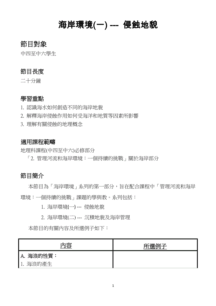 海岸環境(一) --- 侵蝕地貌節目對象中四至中六學生節目長度二十分鐘學習重點1. 認識海水如何創造不同的海岸地貌2. 解釋海岸侵蝕作用如何受海洋和地質等因素所影響3. 理解有關侵蝕的地理概念適用課程範疇地理科課程(中四至中六)必修部分「2. 管理河流和海岸環境:一個持續的挑戰」關於海岸部分節目簡介本節目為「海岸環境」系列的第一部分,旨在配合課程中「管理河流和海岸環境:一個持續的挑戰」課題的學與教系列包括:1. 海岸環境(一) --- 侵蝕地貌2. 海岸環境(二) --- 沉積地貌及海岸管理本節目的有關內容及所選例子如下:內容所選例子A. 海浪的性質:1. 海浪的產生2. 海浪的侵蝕能力:a. 海浪能量 (風速、吹程、風吹持續時間)b. 海岸坡度 (破浪、潮汐)3. 波浪的侵蝕作用 (水力作用、磨蝕作用、磨耗作用、溶蝕作用)長洲東灣仔、香港西部海岸(后海灣)及 香港東部海岸(西貢海面)B. 海岸侵蝕地貌及其形成過程1. 弱線 (裂縫、節理、斷層線)2. 海灣及岬3. 海蝕隙長洲東灣仔 4. 海蝕凹地5. 海蝕洞6. 浪蝕平臺7. 海崖鴨洲 8. 吹洞鶴咀9. 海蝕拱西貢海面使用建議教師可根據學生及課堂情況,參考使用以下建議。
