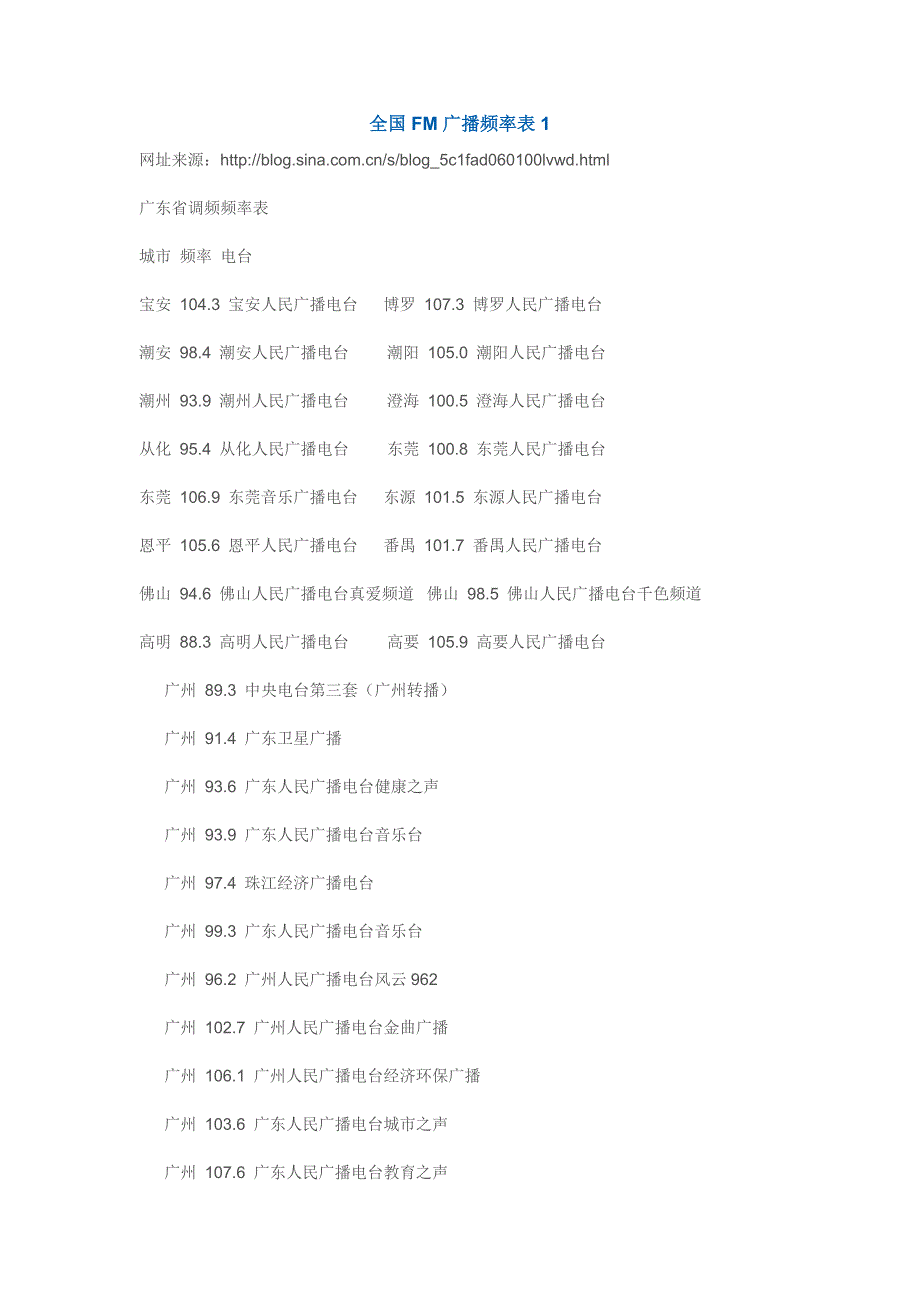 全国FM广播频率表1网址来源: 城市 频率 电台 宝安 104.3 宝安人民广播电台 博罗 107.3 博罗人民广播电台 潮安 98.4 潮安人民广播电台 潮阳 105.0 潮阳人民广播电台 潮州 93.9 潮州人民广播电台 澄海 100.5 澄海人民广播电台 从化 95.4 从化人民广播电台 东莞 100.8 东莞人民广播电台 东莞 106.9 东莞音乐广播电台 东源 101.5 东源人民广播电台 恩平 105.6 恩平人民广播电台 番禺 101.7 番禺人民广播电台 佛山 94.6 佛山人民广播电台真爱频道 佛山 98.5 佛山人民广播电台千色频道高明 88.3 高明人民广播电台 高要 105.9 高要人民广播电台 广州 89.3 中央电台第三套(广州转播) 广州 91.4 广东卫星广播 广州 93.6 广东人民广播电台健康之声 广州 93.9 广东人民广播电台音乐台 广州 97.4 珠江经济广播电台 广州 99.3 广东人民广播电台音乐台 广州 96.2 广州人民广播电台风云962 广州 102.7 广州人民广播电台金曲广播 广州 106.1 广州人民广播电台经济环保广播 广州 103.6 广东人民广播电台城市之声 广州 107.6 广东人民广播电台教育之声 广州 105.2 羊城交通广播电台 河源 92.2 河源人民广播电台 河源 97.8 河源人民广播电台 鹤山 104.7 鹤山人民广播电台 花都 100.5 花都人民广播电台 化州 105.5 化州人民广播电台 惠阳 99.5 惠阳人民广播电台 惠州 103.4 惠州人民广播电台 惠东 96.1 惠东电台 江门 100.2 江门人民广播电台 揭阳 103.9 揭阳人民广播电台 开平 95.6 开平人民广播电台 乐昌 100.1 乐昌人民广播电台 梅州 94.8 梅州人民广播电台 茂名 106.1 茂名人民广播电台 南澳 90.0 南澳人民广播电台 南海 92.4 南海人民广播电台 饶平 101.7 饶平人民广播电台 三水 90.6 三水人民广播电台 汕头 99.3 汕头人民广播电台新闻台 汕头 102.5 汕头人民广播电台经济台 汕头 107.1 汕头人民广播电台音乐台 深圳 89.8 深圳人民广播电台第一台 深圳 97.1 深圳人民广播电台第二台 深圳 105.2 深圳人民广播电台交通台 深圳 105.7 珠江经济广播电台流行1057 顺德 90.1 顺德人民广播电台 遂溪 104.8 遂溪人民广播电台 台山 90.4 台山人民广播电台 新会 98.3 新会人民广播电台 粤北 101.0 广东卫星广播 粤东 92.8 广东卫星广播 粤西 94.0 广东卫星广播 粤中 102.2 广东卫星广播 增城 89.0 增城人民广播电台 湛江 89.3 湛江人民广播电台 肇庆 90.9 肇庆人民广播电台第二台 肇庆 92.9 肇庆人民广播电台第一台 中山 96.7 中山人民广播电台 珠海 95.1 珠海人民广播电台第一台 珠海 87.5 珠海人民广播电台第二台 紫金 105.2 紫金人民广播电台 清远 88.7 清远人民广播电台 佛冈 104.0 佛冈人民广播电台 英德 99.9 英德人民广播电台 小塘 107.4 小塘电台 四会 100.9 四会电台 从化 99.8 广州电台风云962(从化转播) 五华 89.2 五华电台 阳春 103.4 阳春电台 云浮 100.6 云浮电台 信宜 98.9 信宜电台 阳江 97.2 阳江电台香港地区调频频率表地点 频率 电台 功率kW 笔架山 89.2 商业电台第一台 0.15 笔架山 91.1 商业电台第二台 0.15 笔架山 93.5 香港电台第一台 0.15 笔架山 96.3 香港电台第二台 0.15 笔架山 98.1 香港电台第四台 0.15 笔架山 100.5 新城电台新城997 0.15 笔架山 102.4 新城电台精选104 0.15 舂坎角 106.8 香港电台第三台 0.06 大坑道 100.9 香港电台普通话台 0.005 飞鹅山 64.4 香港电台第一台 1 飞鹅山 89.5 商业电台第一台 1 飞鹅山 92.1 商业电台第二台 1 飞鹅山 96.9 香港电台第二台 1 飞鹅山 98.9 香港电台第四台 1 飞鹅山 101.8 新城电台新城997 1 飞鹅山 106.3 新城电台精选104 1 歌赋山 88.1 商业电台第一台 3 歌赋山 90.3 商业电台第二台 3 歌赋山 92.6 香港电台第一台 3 歌赋山 94.8 香港电台第二台 3 歌赋山 97.6 香港电台第四台 3 歌赋山 99.7 新城电台新城997 3 歌赋山 104.0 新城电台精选104 3 金山 88.9 商业电台第一台 0.1 金山 90.9 商业电台第二台 0.1 金山 92.9 香港电台第一台 0.1 金山 95.6 香港电台第二台 0.1 金山 98.4 香港电台第四台 0.1 金山 101.6 新城电台新城997 0.1 金山 105.5 新城电台精选104 0.1 九龙坑山 88.3 商业电台第一台 0.5 九龙坑山 90.7 商业电台第二台 0.5 九龙坑山 93.2 香港电台第一台 0.5 九龙坑山 95.3 香港电台第二台 0.5 九龙坑山 97.8 香港电台第四台 0.5 九龙坑山 100.0 新城电台新城997 0.5 九龙坑山 104.7 新城电台精选104 0.5 南丫 89.1 商业电台第一台 0.5 南丫 91.6 商业电台第二台 0.5 南丫 93.6 香港电台第一台 0.5 南丫 96.0 香港电台第二台 0.5 南丫 98.2 香港电台第四台 0.5 南丫 102.1 新城电台新城997 0.5 南丫 104.5 新城电台精选104 0.5 聂高信山 97.9 香港电台第三台 0.01 青山 88.6 商业电台第一台 0.7 青山 91.2 商业电台第二台 0.7 青山 93.4 香港电台第一台 0.7 青山 96.4 香港电台第二台 0.7 青山 98.7 香港电台第四台 0.7 青山 100.4 新城电台新城997 0.7 青山 102.5 新城电台精选104 0.7 青山 106.8 香港电台第五台北京调频电台频率表 城市 频率 电台 北京 87.6 北京人民广播电台文艺台 北京 88.2 中国国际广播电台EasyFM 北京 88.7 中国国际广播电台 北京 90.0 中央人民广播电台 第三套节目文艺调频 北京 91.5 中国国际广播电台EasyFM 北京 96.6 中央人民广播电台 第二套节目经济频道 北京 97.4 北京人民广播电台音乐台 北京 99.6 中央人民广播电台第二套节目 北京 101.8 中央人民广播电台 第四套节目民族广播 北京 103.9 北京人民广播电台交通台 北京 106.1 中央人民广播电台 第一套节目综合频道 福建调频电台频