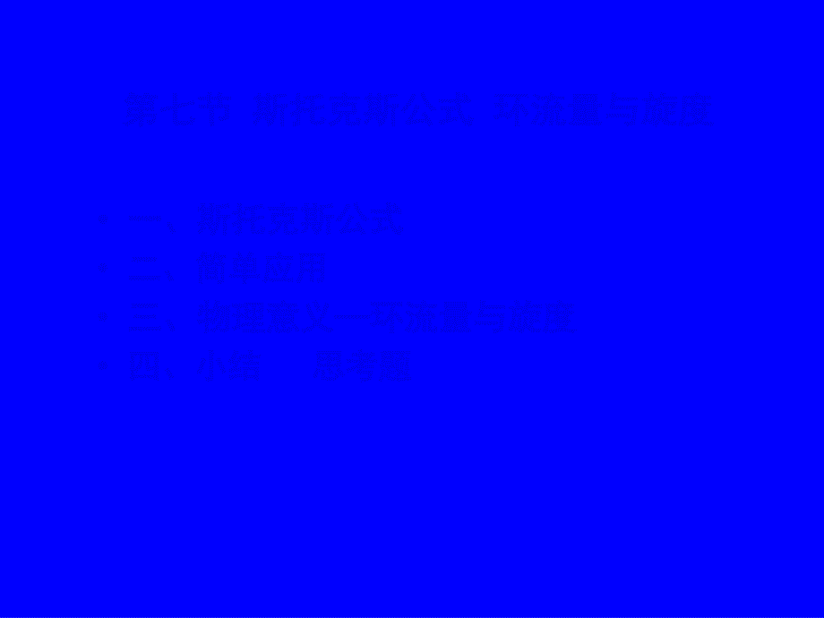 1),取上侧首先,可以证明,由格林公式,所以,又,(1),取上侧所以,(2)若,取下侧,上式仍成立,(3)若平行于,z,轴的直线与,的交,点多于一个,则类似于格林公式的处,理,可以说明上式也成立总之,在基本假定下,上式总,成立同理:,三式相加,并归类得,该等式称为斯托克斯公式,该等式称为斯托克斯公式,(1)在公式中,,的侧向与 的方向要符合右手规则,(2)为帮助记忆,引入如下行列式记号,按第一行展开,并约定,该等式称为斯托克斯公式,再利用关系式,公式又可以写成,(3)若,是,xoy,面上的平面区域,D,,则,(4)斯托克斯公式的一个典型应用是将左边的曲线,积分化为右边的曲面积分,再利用曲面积分的方法或,高斯公式进行计算,从而达到简化曲线积分的计算解,应用斯托克斯公式的一个关键步骤或技巧是,找一张曲面,:,它以,为边界,,且它的侧向,与,的方向符合右手规则本题中取,为 所围的三角形区域,,上侧又设,在,xoy,面上的投影区域为,例1:计算曲线积分,解,例1:计算曲线积分,解,例2:计算,其中:,为球面,与圆柱面,的交线,,若从,oz,轴正向看去,取逆时针方向,取以,为边界的球面为:,上侧,,在,+上应用斯托克斯,公式,例2:计算,解,例2:计算,解,二、物理意义-环流量与旋度,1.环流量的定义:,设有向量场,为场中一条有向闭曲线,,则称曲线积分,为该向量场沿有向闭曲线,的环流量。