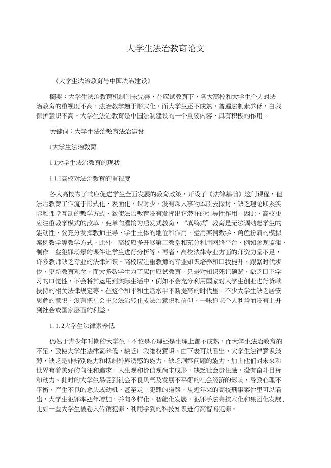 摘要:大学生法治教育机制尚未完善,在应试教育下,各大高校和大学生个人对法 治教育的重视度不高,法治教学趋于形式化。而大学生还不成熟,普遍法制素养低,白我 保护意识不高。大学生法治教育是中国法制建设的一个重要内容,具有积极的作用。