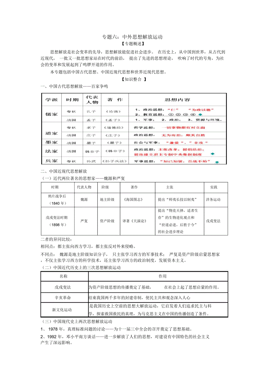 专题六:中外思想解放运动【专题概述】思想解放是社会变革的先导,思想解放能促进社会进步 在历史上,从中国到世界,从古代到近现代, 一批又一批思想家站在时代的前沿, 提出了先进的思想理论, 吹响了时代的号角,为社会的变革和发展起到了鸣锣开道的作用本专题包括中国古代思想、中国近现代思想和世界近现代思想知识整合 】一、中国古代思想解放——百家争鸣二、中国近现代思想解放(一)近代两位著名的思想家——魏源和严复时期代表人物阶级著作主张实践鸦片战争后魏源地主阶级《海国图志》提出“师夷长技以制夷”洋务运动(1840 年)提出“物竞天择,适者生戊戌变法时期严复资产阶级译著《天演论》存”的生物进化观点和戊戌变法(1898 年)“世道必进,后胜于今”的社会进步理论二者的异同比较:相同点:都主张向西方学习,都主张反对外来侵略不同点: 魏源是地主阶级知识分子, 只主张学习西方的军事技术; 严复是资产阶级启蒙思想家,不仅主张学习西方的科学技术,还主张学习西方的政治制度,发展资本主义二)中国近代历史上的三次思想解放运动名称作用戊戌变法为资产阶级思想的传播奠定了基础,在社会上起了思想启蒙的作用辛亥革命结束我国两千多年的封建帝制,使民主共和观念深入人心是我国历史上空前的思想大解放运动,它启发着人们追求民主与科新文化运动学,探索救国救民的真理,为马克思主义在中国的传播创造了条件。