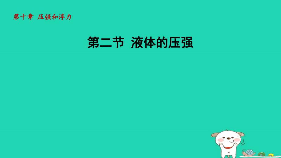 第二节第二节 液体的压强液体的压强第十章第十章 压强压强和浮力和浮力逐点逐点导讲练导讲练课堂课堂小结小结作业作业提升提升学习目标学习目标课时讲解1课时流程2u液体压强的液体压强的特点特点u探究影响液体内部压强的探究影响液体内部压强的因素因素u液体内部压强的特点液体内部压强的特点知识点液体压强的特点液体压强的特点知知1 1讲讲感悟新知感悟新知11.观察观察体验体验 如图如图1 甲所示,向玻璃管内加水,玻璃管底部甲所示,向玻璃管内加水,玻璃管底部橡皮橡皮膜向外凸出;如图乙所示,手指触压装满水的塑料膜向外凸出;如图乙所示,手指触压装满水的塑料袋,袋,手指手指感受到水的压力感受到水的压力;如如图丙所示,把下部蒙图丙所示,把下部蒙有有橡皮橡皮膜的空膜的空玻璃玻璃管插入管插入水水中中,橡皮膜向内凹,橡皮膜向内凹.知知1 1讲讲感悟新知感悟新知分析思考分析思考(1)图图甲中,玻璃管底部橡皮膜向外凸出,甲中,玻璃管底部橡皮膜向外凸出,说说明明液体对容器的什么位置有压强?液体对容器的什么位置有压强?分析结果分析结果液体液体对容器对容器的底部的底部有压强有压强.知知1 1讲讲感悟新知感悟新知(2)图图乙中,手指感受到水的压力,说明液体对容器乙中,手指感受到水的压力,说明液体对容器的什么的什么位置有压强?位置有压强?分析结果分析结果液体对容器液体对容器的侧壁的侧壁有压强有压强.知知1 1讲讲感悟新知感悟新知(3)图图丙中,空玻璃管底部橡皮膜向内凹,说明液体丙中,空玻璃管底部橡皮膜向内凹,说明液体的什么的什么位置有压强?位置有压强?分析结果分析结果液体内部液体内部有压强有压强.知知1 1讲讲感悟新知感悟新知2.实验结论实验结论 液体对容器的底部和侧壁都有压强,液体的液体对容器的底部和侧壁都有压强,液体的内内部也部也有压强有压强.知知1 1讲讲感悟新知感悟新知关联思考关联思考(1)为什么为什么液体对容器底部和侧壁都有压强?液体对容器底部和侧壁都有压强?关联结果关联结果液体液体由于由于受到重力受到重力会对容器底部会对容器底部产生压强产生压强;而液体的;而液体的流动流动性决定性决定液体不仅对容器液体不仅对容器底部底部有压强,对容器的有压强,对容器的侧壁侧壁也也有压强有压强.知知1 1讲讲感悟新知感悟新知(2)图图丙中,橡皮膜向内凹,说明液体内部有什么方向丙中,橡皮膜向内凹,说明液体内部有什么方向的的压强压强?关联结果关联结果图丙中橡皮图丙中橡皮膜向膜向内凹,说明液体内凹,说明液体内部有内部有向上的压强向上的压强.感悟新知感悟新知知知1 1练练模拟模拟无锡无锡 如图如图2 所示,一个空的塑料药瓶,所示,一个空的塑料药瓶,瓶口扎瓶口扎上橡皮膜,竖直浸入水中,第一次瓶口朝上,第二次上橡皮膜,竖直浸入水中,第一次瓶口朝上,第二次瓶口朝下,两次药瓶在水中瓶口朝下,两次药瓶在水中的的位置位置相同,发现橡皮膜都向相同,发现橡皮膜都向内内凹凹,且第二且第二次比第一次凹陷次比第一次凹陷得得更更明显明显,例 1感悟新知感悟新知知知1 1练练表明表明水水的内部的内部深度越大水的压强深度越大水的压强越越_;若要验;若要验证证液体内部各个方向都有压强,液体内部各个方向都有压强,接着操作接着操作步骤步骤是是_;如果没有如果没有橡皮膜橡皮膜,水,水_(填填“会会”或或“不会不会”)产生产生压压强强.大大将将药瓶水平放置观察橡皮膜是否向内药瓶水平放置观察橡皮膜是否向内凹凹会会感悟新知感悟新知知知1 1练练解题秘方:解题秘方:运用带橡皮膜的药瓶探究液体内部压强的运用带橡皮膜的药瓶探究液体内部压强的特点时特点时,根据橡皮膜凹凸的方向判断压力的方向,根,根据橡皮膜凹凸的方向判断压力的方向,根据橡皮膜据橡皮膜形变程度形变程度判断液体压强的大小判断液体压强的大小.解析:解析:第一次瓶口朝上,橡皮膜在水中的深度较小,第一次瓶口朝上,橡皮膜在水中的深度较小,第二次第二次瓶口朝下,橡皮膜在水中的深度较大,第二次瓶口朝下,橡皮膜在水中的深度较大,第二次比第一次比第一次凹陷得凹陷得更明显,由此可知液体内部深度越大更明显,由此可知液体内部深度越大,液体产生的压强,液体产生的压强越大;越大;感悟新知感悟新知知知1 1练练两两次实验的现象可以说明液体内部有向下和向上的压次实验的现象可以说明液体内部有向下和向上的压强强,这时,这时应将药瓶水平放置观察液体内部是否有水平应将药瓶水平放置观察液体内部是否有水平方向的压强方向的压强;实验;实验中通过橡皮膜的凹陷程度来反映液中通过橡皮膜的凹陷程度来反映液体内部压强的大小,体内部压强的大小,若没有若没有橡皮膜,由于水受重力的橡皮膜,由于水受重力的作用且具有流动性,水仍然会作用且具有流动性,水仍然会产生产生压强压强.感悟新知感悟新知知知1 1练练1.模拟模拟南京南京 观察观察实验实验现象回答问题现象回答问题:(1)观察观察图图3A 中现象中现象,底部,底部扎有橡皮膜扎有橡皮膜装有装有水的水的管子,发现橡皮膜管子,发现橡皮膜向下向下凸出,凸出,说明水对说明水对管子底部有管子底部有_.(2)观察观察图图B 中现象中现象,侧面,侧面开着几个小孔开着几个小孔且且装有