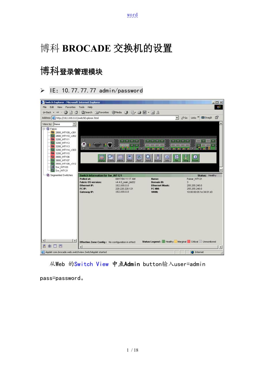 3. 连起来就可以用了具体如下:1)2) 输入USER:admin/PASS:password3) 改名DoMain〔Disable〕a) switchdisableb) switch:admin>switch "sw1"(第1台)c) switch:admin>switch "sw2"(第2台)4) 改IPa) SW1:ADMIN>ipAddrSet b)c) ETHERNET IP ADDRESS 192.168.0.1〔管理端口的IP用于接到LAN用WEB可管理,IP根据你的网络自行设定〕d) FIRBIER CHANNEL IP 165.156.138.1〔SAN里的IP,Z自行设定〕网关,缺省就行交换机重启第1交换机完成第2交换机同理改第1个交换机域名:1. sw1:admin>switchdisable2. config3. FABIRC PARAMATERS 输 Y4. DOMAIN :〔1...239〕3〔自选一个〕5. CTRL+D6. switchenable改第2个,同理 / 。