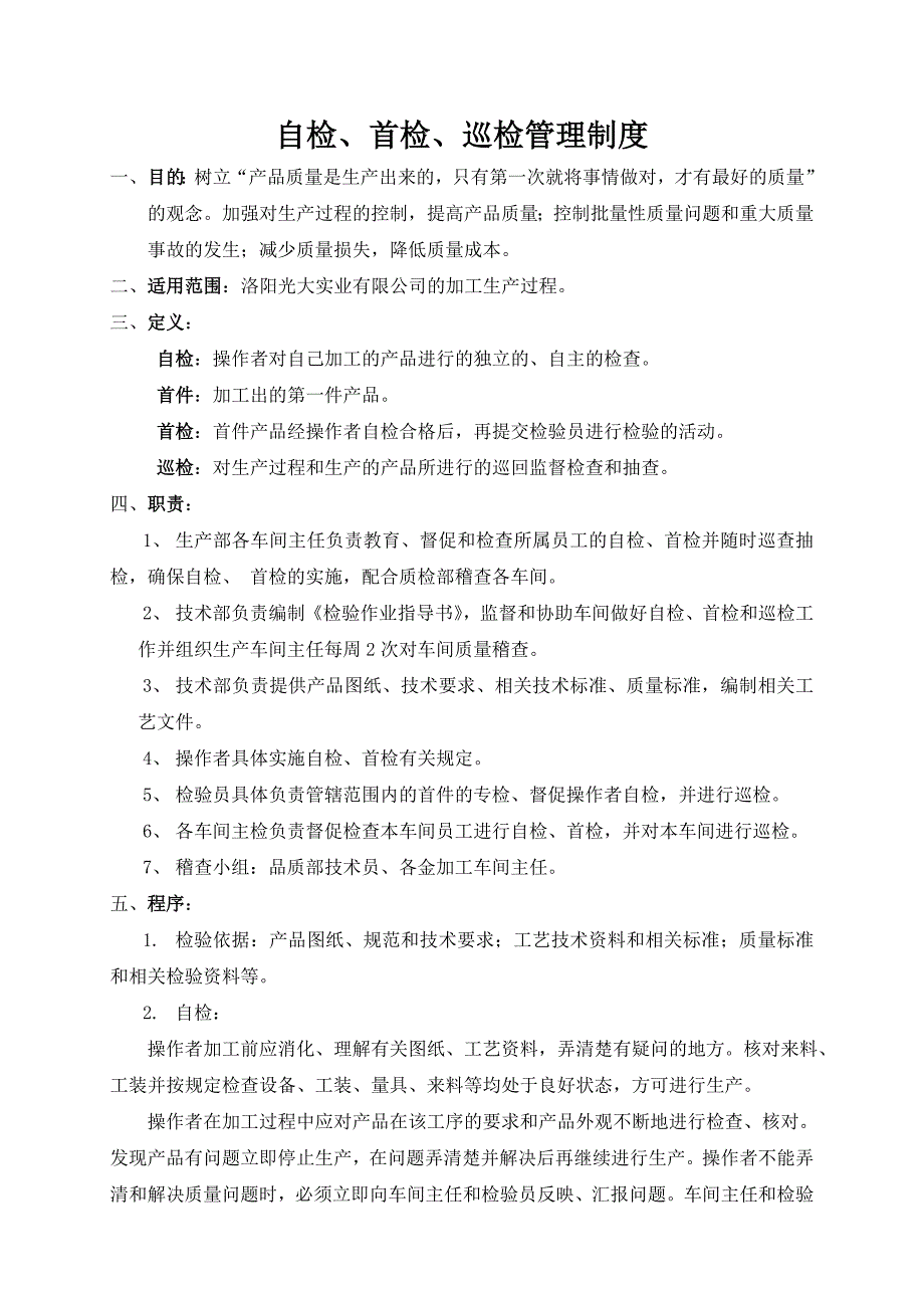 自检、首检、巡检管理制度自检、首检、巡检管理制度一、目的目的:树立“产品质量是生产出来的,只有第一次就将事情做对,才有最好的质量”的观念加强对生产过程的控制,提高产品质量;控制批量性质量问题和重大质量事故的发生;减少质量损失,降低质量成本二、适用范围适用范围:洛阳光大实业有限公司的加工生产过程三、定义定义:自检自检:操作者对自己加工的产品进行的独立的、自主的检查首件首件:加工出的第一件产品首检首检:首件产品经操作者自检合格后,再提交检验员进行检验的活动巡检巡检:对生产过程和生产的产品所进行的巡回监督检查和抽查四、职责职责:1、 生产部各车间主任负责教育、督促和检查所属员工的自检、首检并随时巡查抽检,确保自检、 首检的实施,配合质检部稽查各车间2、 技术部负责编制《检验作业指导书》 ,监督和协助车间做好自检、首检和巡检工作并组织生产车间主任每周 2 次对车间质量稽查3、 技术部负责提供产品图纸、技术要求、相关技术标准、质量标准,编制相关工艺文件4、 操作者具体实施自检、首检有关规定5、 检验员具体负责管辖范围内的首件的专检、督促操作者自检,并进行巡检6、 各车间主检负责督促检查本车间员工进行自检、首检,并对本车间进行巡检。