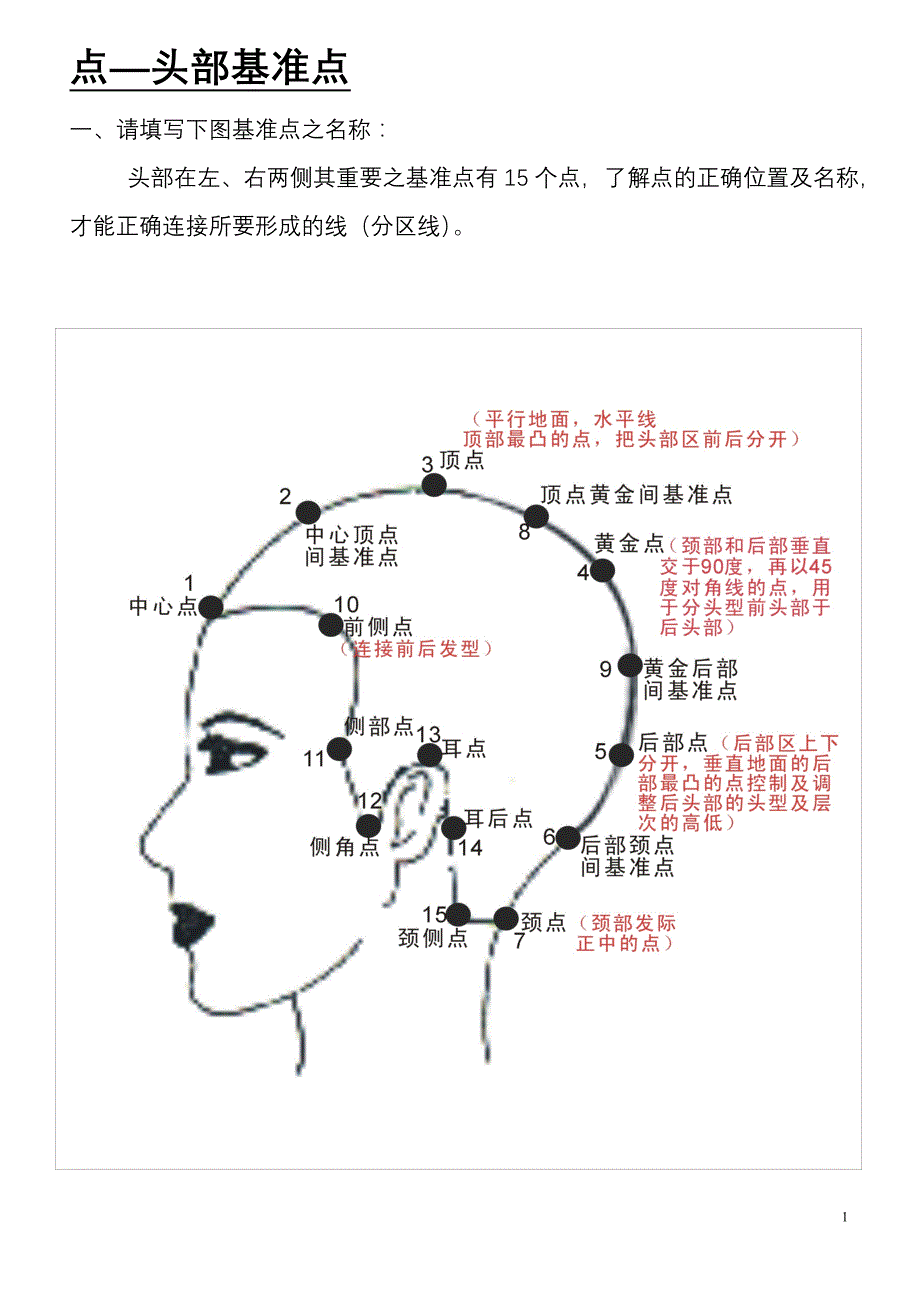 点—头部基准点一、请填写下图基准点之名称: 头部在左、右两侧其重要之基准点有15个点,了解点的正确位置及名称,才能正确连接所要形成的线(分区线)英文简称中文名称作用1.C.P中心点(又称美人间,过鼻尖垂直交于发际线的点把头部左右分开)平衡脸际左右2.C.T.M.P中心顶点间基点(与顶点的1/2处)扩大或缩小划分区3.T.P顶点区分顶部前后的发量4.G.P黄金点区分前后部分5.B.P后部点区分后头部上下位置6.B.N.M.P后部颈间基准点后部点与颈点之间1/2 处7.N.P颈点(位于后头部最低处用于中心部控制后头部)平衡颈背左右头发8.T.G.M.P顶点黄金间基准点控制发型的层次比例9.G.B.M.P黄金后部间基准点两点之间1/2处10.F.S.P前侧点侧部水平与垂直的转折点11.S.P侧部点修饰颧骨12.S.C.P侧角点确定鬓角的长度13.E.P耳点侧部发际最高的点14.E.B.P耳后点侧部与后部的交点15.N.S.P颈侧点确定外轮廓最凸的点线—七条主设计线(分区线)以分区线分区,其重要性在于如何掌控头型,完美呈现发型的轮廓及精确裁剪一、 请填写分区线之名称:1、 中心线 4、对角线 7、脸际线2、 U字线 5、水平线 8、颈背线3、 侧中线 6、边沿线 9、颈侧线二、 请填写分区线位置与作用: (分区线位置) 1、 中心线—位置:从中心点到颈点的的连接线;从中心点经顶点到黄金点再到颈点;作用:①、使头部两边发量均匀,左右对称; ②、控制及平衡头部左右发量及发型的美感; ③、中心线在特殊情况下可移动,可视发型的需要而作移动;2、 U字线—位置:前侧点经黄金点到另一前侧点;作用:①、确定头顶部的区域; ②、把头圆上水平面与垂直面区分开来; ③、修饰额头及脸型,控制顶区发量; ④、可根据发型的需要放大或缩小; ⑤、控制头部区的发量;3、侧中线—位置:耳点经顶点到另一侧耳点的垂直连接线;作用:①、可区分侧部的前后位置; ②、控制侧部发量的多少; ③、可根据发型的需要移动(移至耳后点或颈侧点)向后移增加发量; ④、调整侧部区域或前后重量转折移动;4、对角线—位置:耳点经黄金点到另一侧耳点的连接线;作用:①、控制侧部发量; ②、可把头部分为上下两半,分头部前后区; ③、区分与平衡头部上半部和下半部的重量; ④、可移动;5、水平线—位置:耳后点经后部点到另一侧耳后点的连接线;作用:①、把后头部的发量分为上下两部分; ②、控制后头部上下,决定发型层次位置高低(重量)的转折点; ③、一定要平; ④、调整后部区的上下重量,转折位置;6、边沿线—位置:侧部发际线上移2cm,沿着发际线走;作用:①、确定发型外轮廓的长度与形状; ②、修饰身材; ③、控制发型的外轮廓; PS:外轮廓:头发自然下垂最底层的形态;7、 脸际线—位置:从中心点到侧角点(两边)的连接线;作用:①、修饰脸型;②、确定浏海的长度及形态; ③、控制发型的头部区,外在头发的长短;8、 颈背线:颈侧点过颈点到另一颈侧点; 作用:控制颈背发量的移动;9、 颈侧线:耳点到颈侧点;作用:控制颈背发际的形状,用于女式短发;线—七条分层划分线(分层线)分层线将分好的发区再分几层,以便于裁剪时更精确控制发型之重量状态(请填写)。