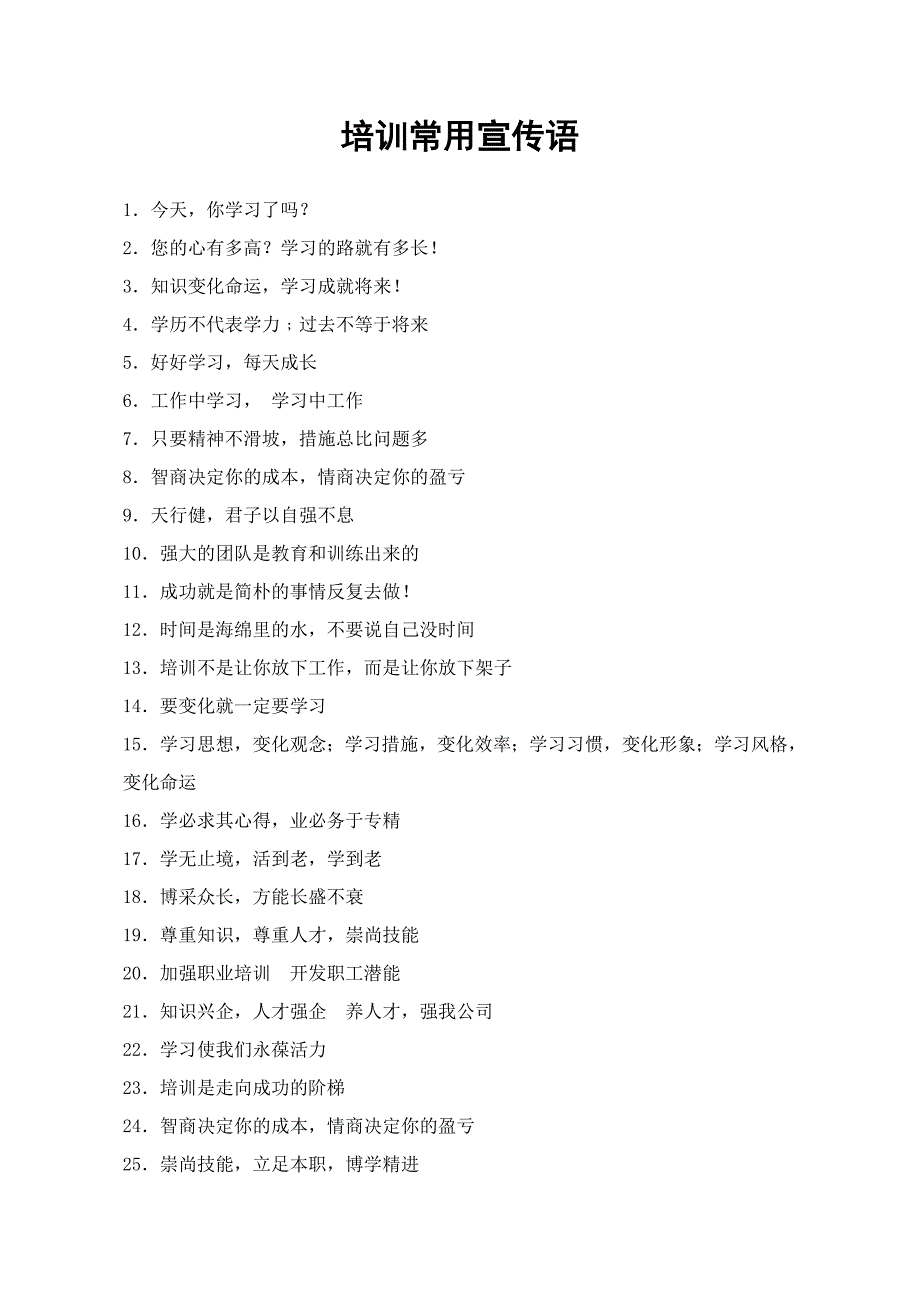 培训常用宣传语1.今天,你学习了吗?2.您的心有多高?学习的路就有多长!3.知识变化命运,学习成就将来!4.学历不代表学力﹔过去不等于将来5.好好学习,每天成长6.工作中学习, 学习中工作7.只要精神不滑坡,措施总比问题多8.智商决定你的成本,情商决定你的盈亏9.天行健,君子以自强不息10.强大的团队是教育和训练出来的11.成功就是简朴的事情反复去做!12.时间是海绵里的水,不要说自己没时间13.培训不是让你放下工作,而是让你放下架子14.要变化就一定要学习15.学习思想,变化观念;学习措施,变化效率;学习习惯,变化形象;学习风格,变化命运16.学必求其心得,业必务于专精17.学无止境,活到老,学到老18.博采众长,方能长盛不衰19.尊重知识,尊重人才,崇尚技能20.加强职业培训 开发职工潜能21.知识兴企,人才强企 养人才,强我公司22.学习使我们永葆活力23.培训是走向成功的阶梯24.智商决定你的成本,情商决定你的盈亏25.崇尚技能,立足本职,博学精进26.知识变化命运,技能成就事业27.培养高技能人才,造就一流员工队伍28.挑战自我 变化自我 完善自我29.知识使用才有价值,智能共享方显实力30.学历代表的只是过去,不断的学习才是我们的将来!31.智者视每日为新生成功32.成功就是每天进步一点点33.简朴的招式练到了极致就是绝招34.态度决定命运,深度决定高度35.博已广学,厚积薄发36.学必求其心得 业必务于专精 37.只为成功找措施 不为失败找理由;38.人在一起不是团队,心在一起才是团队; 39.公司执行力的核心在于集体的执行力 40.相信并做到才是力量 41.精心铸就团队 体现个人价值 42.学习力就是竞争力 43.态度源于责任 目的决定激情 44.知识是遨游世界的翅膀 45.确没有品质,便没有公司的明天。