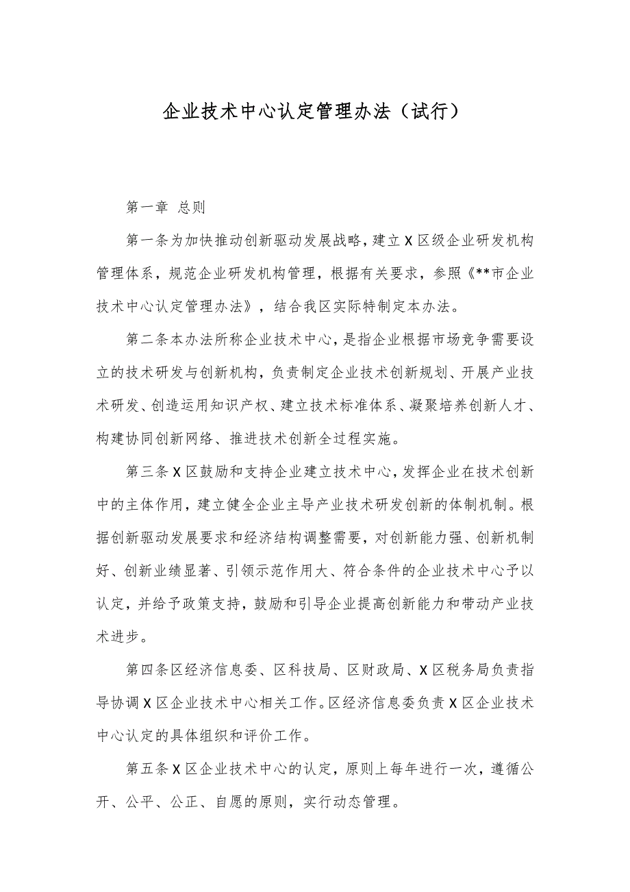 企业技术中心认定管理办法(试行)第一章 总则第一条为加快推动创新驱动发展战略,建立X区级企业研发机构管理体系,规范企业研发机构管理,根据有关要求,参照《**市企业技术中心认定管理办法》,结合我区实际特制定本办法第二条本办法所称企业技术中心,是指企业根据市场竞争需要设立的技术研发与创新机构,负责制定企业技术创新规划、开展产业技术研发、创造运用知识产权、建立技术标准体系、凝聚培养创新人才、构建协同创新网络、推进技术创新全过程实施第三条X区鼓励和支持企业建立技术中心,发挥企业在技术创新中的主体作用,建立健全企业主导产业技术研发创新的体制机制根据创新驱动发展要求和经济结构调整需要,对创新能力强、创新机制好、创新业绩显著、引领示范作用大、符合条件的企业技术中心予以认定,并给予政策支持,鼓励和引导企业提高创新能力和带动产业技术进步第四条区经济信息委、区科技局、区财政局、X区税务局负责指导协调X区企业技术中心相关工作区经济信息委负责X区企业技术中心认定的具体组织和评价工作第五条 X区企业技术中心的认定,原则上每年进行一次,遵循公开、公平、公正、自愿的原则,实行动态管理第二章 申报与认定第六条 X区企业技术中心应当具备以下基本条件:(一)申报企业须是X区范围内工商注册的独立法人企业,成立并运行一年以上,具有较好的技术创新机制,企业技术中心组织体系健全,发展规划和目标明确,具有较强的技术创新能力;(二)企业营业收入2000万元以上;(三)有专门的研发场地,有必要的测试、分析手段和工艺设备,原则上用于研究开发的仪器设备原值不低于100万元;(四)有一定的研发经费投入,原则上年度研究与试验发展经费支出额不低于80万元;(五)有一定的研发人员,原则上专职研发人员不少于5人;(六)企业技术中心有为企业提供技术研发、产业化技术支撑、试验等技术服务的能力;(七)企业信用良好,申报时未列入国家企业信用信息公示系统、信用中国等系统严重违法失信企业名单和重大税收违法案件信息公布名单。