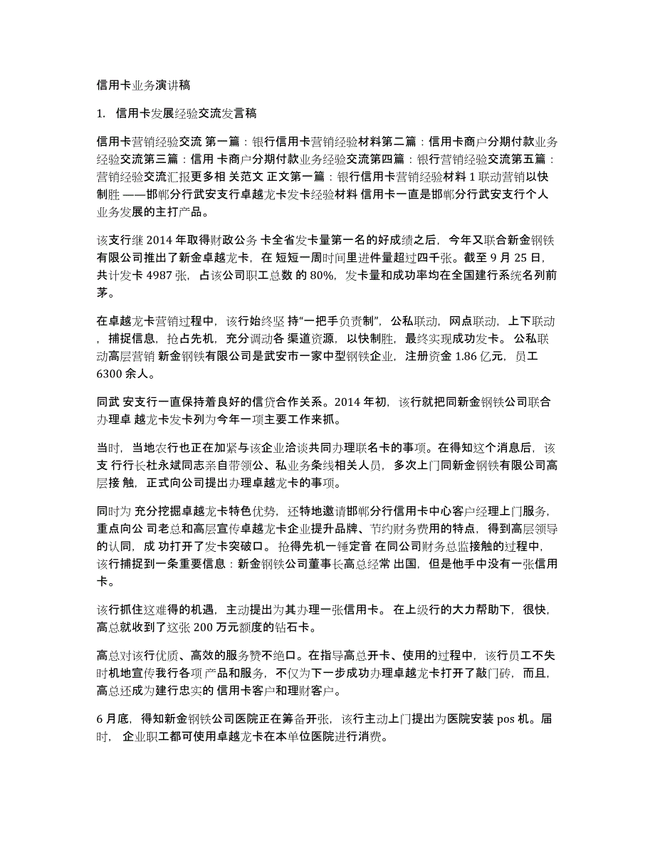 信用卡业务演讲稿1. 信用卡发展经验交流发言稿信用卡营销经验交流 第一篇:银行信用卡营销经验材料第二篇:信用卡商户分期付款业务经验交流第三篇:信用 卡商户分期付款业务经验交流第四篇:银行营销经验交流第五篇:营销经验交流汇报更多相 关范文 正文第一篇:银行信用卡营销经验材料 1 联动营销以快制胜 ——邯郸分行武安支行卓越龙卡发卡经验材料 信用卡一直是邯郸分行武安支行个人业务发展的主打产品该支行继2014 年取得财政公务 卡全省发卡量第一名的好成绩之后,今年又联合新金钢铁有限公司推出了新金卓越龙卡,在 短短一周时间里进件量超过四千张截至9 月25 日,共计发卡4987 张,占该公司职工总数 的80%,发卡量和成功率均在全国建行系统名列前茅在卓越龙卡营销过程中,该行始终坚 持“一把手负责制”,公私联动,网点联动,上下联动,捕捉信息,抢占先机,充分调动各 渠道资源,以快制胜,最终实现成功发卡 公私联动高层营销 新金钢铁有限公司是武安市一家中型钢铁企业,注册资金1.86 亿元,员工6300 余人同武 安支行一直保持着良好的信贷合作关系2014 年初,该行就把同新金钢铁公司联合办理卓 越龙卡发卡列为今年一项主要工作来抓。