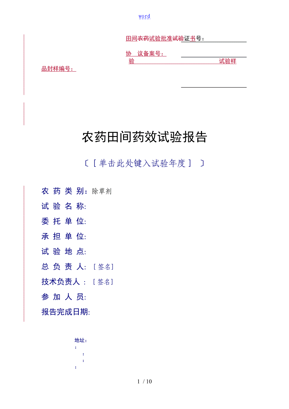 word田间农药试验批准试验证书号:协协 议备案号:验 试验样品封样编号:农药田间药效试验报告〔[单击此处键入试验年度]〕农 药 类 别:除草剂试 验 名 称: 委 托 单 位: 承 担 单 位: 试 验 地 点: 总 负 责 人:[签名]技术负责人 :[签名]参 加 人 员: 报告完成日期: 地址: : : : : / 田间药效试验报告摘要试验名称: 试验作物: 防治对象: 供试药剂:含量/中(英)文名称/剂型/含量商品名生产单位试验药剂对照药剂施药方法与用水量〔升/公顷〕:试验结果:药剂处理有效成份用量〔毫克/千克或克/公顷〕末次药后株/鲜重防效(%)〔各重复平均值〕差异显著性[单击此处键入试验药剂][单击此处键入对照药剂]适宜施药时期和用量: 使用方法: 安全性: [单击此处键入试验名称]田间药效试验报告1 试验目的[单击此处键入试验目的]2 试验条件2.1 作物和栽培品种的选择[单击此处键入作物和栽培品种名称][单击此处键入作物耕作栽培方式如直播、移栽、套播等]2.2 试验对象杂草的选择[单击此处键入杂草种类与名称〔中文和拉丁学名〕,如人工接种草籽应说明方式方法]2.3 栽培条件[单击此处键入土壤资料与耕作条件等][单击此处键入前茬作物与所用除草剂,防止使用对后茬作物有药害地块]2.4 其他条件[单击此处键入栽培类型、植被演替等其它试验条件]3 试验设计和安排3.1 药剂3.1.1 试验药剂[单击此处键入药剂名称、含量、剂型、生产厂家]3.1.2 对照药剂[单击此处键入药剂名称、含量、剂型、生产厂家]设人工除草和空白对照处理。
