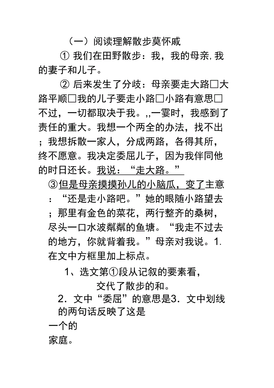 一)阅读理解散步莫怀戚① 我们在田野散步:我,我的母亲,我的妻子和儿子② 后来发生了分歧:母亲要走大路□大路平顺□我的儿子要走小路□小路有意思□不过,一切都取决于我一霎时,我感到了责任的重大我想一个两全的办法,找不出;我想拆散一家人,分成两路,各得其所,终不愿意我决定委屈儿子,因为我伴同他的时日还长我说:“走大路③ 但是母亲摸摸孙儿的小脑瓜,变了主意:“还是走小路吧她的眼随小路望去;那里有金色的菜花,两行整齐的桑树,尽头一口水波粼粼的鱼塘我走不过去的地方,你就背着我母亲对我说1.在文中方框里加上标点1、选文第①段从记叙的要素看,交代了散步的和2.文中“委屈”的意思是3.文中划线的两句话反映了这是一个的家庭4.文中有一处景物描写,试用“_”将它画出来,并说明其作用1、地点人物2.使,,受委屈,在文中指不接受儿子走小路的提议3.尊老爱幼,相互理解4.“那里有,,鱼塘揭示了春天的生机,春天的活力,透露出一种新的希1. 散步》课内阅读文章围绕一家四口写了一件什么事呢?答:我们一家四口在初春的田野散步,在选择走大路和走小路时产生分歧,我决定遵从母亲走大路,母亲却依从了孙儿走小路,走到一处我背起了母亲,妻子背起了儿子,我们深感责任重大。