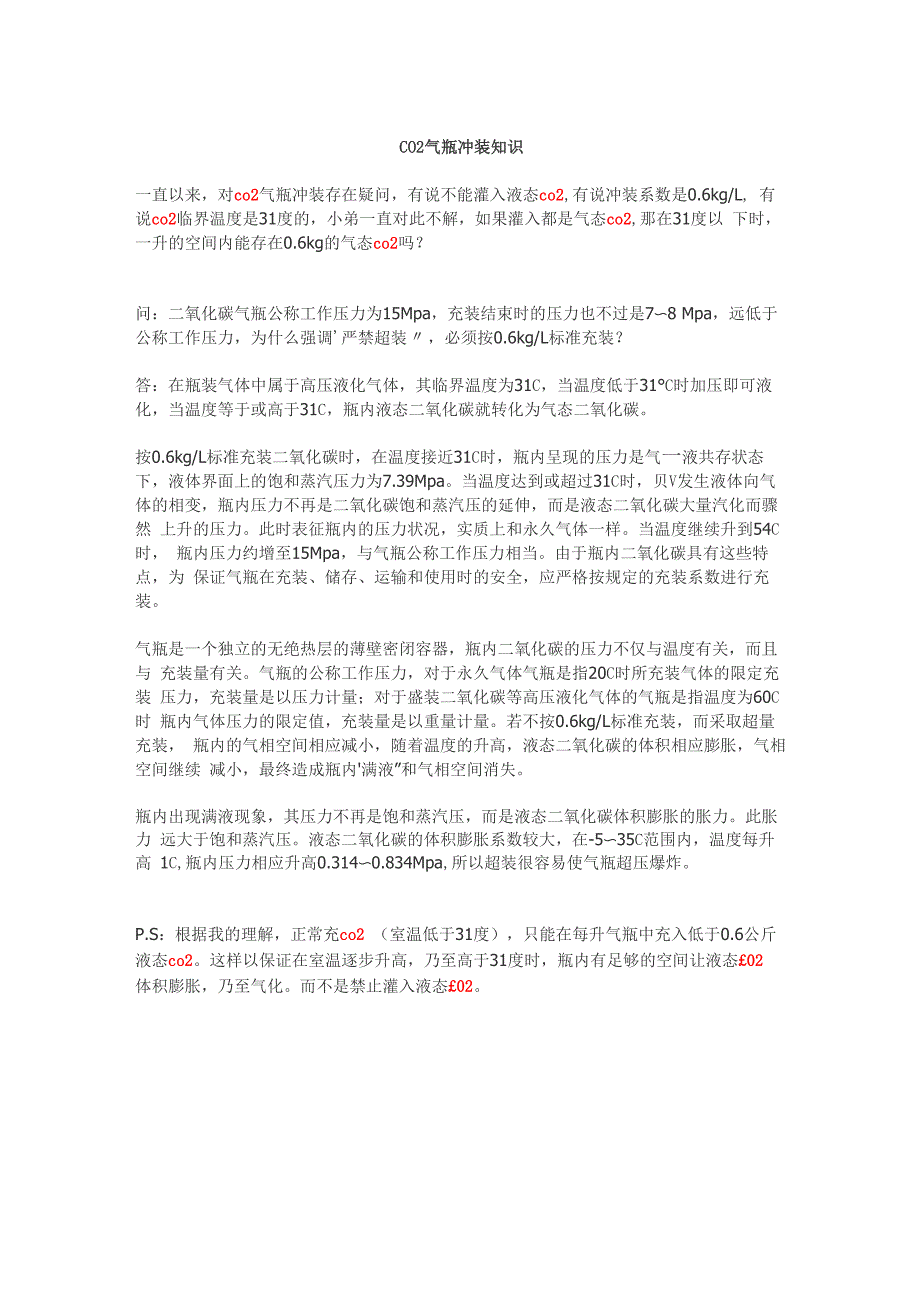 实际我国夏天大部分地区的温度都会超过这个温度,也不见因此 产生什么麻烦当然,实际发生爆炸时,直接诱因都是温度的升高这是因为在相同的密度下,温度越高越容易进入超临界状态其根本原因是密度过高,接近超临界状态与公称压力的关系 实际上,充装量和公称压力也没有什么关系这一点有人可能会觉得不可理解假设我有一 个质量很好的钢瓶,公称压力达到100MPA,那么我是否可以充到50MPA呢?回答是否定 的,即使有这样一个钢瓶,也只能按照0.6kg/L的标准充气,压力也是只能在7—8mpa左 右这是因为进入超临界状态时压强会增加几百倍,再好的钢瓶也没有用而且充的多也不 划算,压强从7mpa到50mpa,可能只是多充了一点点而已从图中可以看到c°2的安全主要考虑就是避免进入超临界状态,而影响进入超临界状态的 关键因素就是密度,与其它因素关系不大据此估算,一般夏天的时候充0.5kg/L,冬天的 时候充0.6kg/L可确保安全。