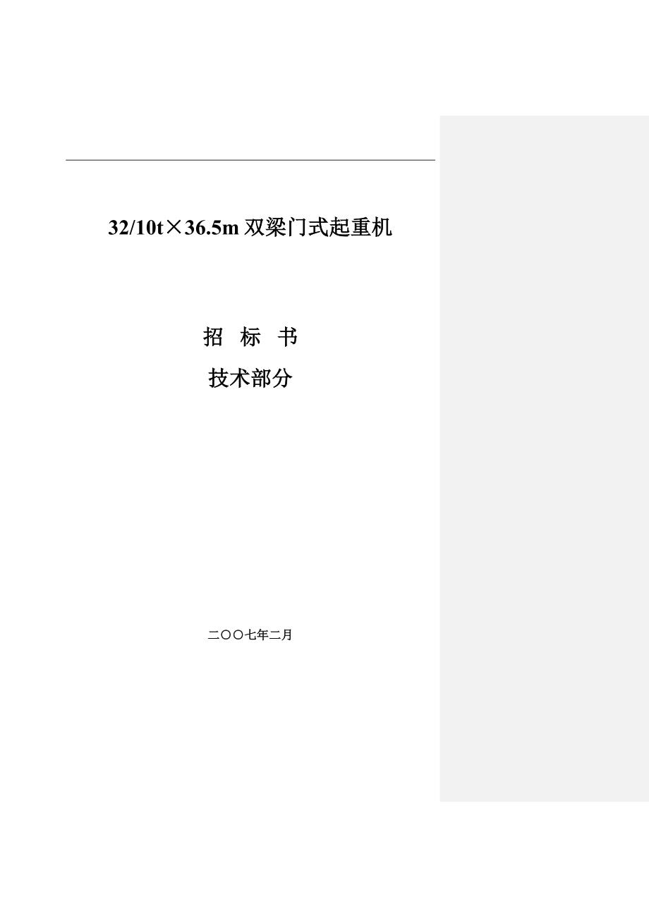 32/10t×36.5m双梁门式起重机招 标 书技术部分二○○七年二月总体要求及功能描述1 、起重机名称:32/10t双梁门式起重机2 、起重机数量:1台3 、起重机用途:主要用于吊运、堆放大于10吨船运钢材钢材码头堆场改造完成后,32吨龙门行车下的堆场面积6440平方米如果按每月1万吨钢材的周转量,全年12万吨,如以市场价每吨15元/吨计算,全年收入为180万元删除4、起重机主要技术性能表主要技术参数起重机名称32/10t双梁门式起重机起重机Q(t)32/10t,数量1台跨度Lk(m)36.5两端悬臂有效长度(m)起升高度(m)主钩(32t)12副钩(10t)13工作级别起重机A6主钩(32t)M6副钩(16t)M6大车走行M6小车走行M6起升速度(m/min)主钩(32t)~9.5副钩(10t)~19.5运行速度(m/min)大车走行~39 ?小车走行~43大车缓冲器高度(mm)轨面以上~880吊钩型式主钩(32t)锻造单钩副钩(10t)锻造单钩结构型式双梁箱型梁,单小车电源AC 380V 50Hz大车供电方式地面上安全滑触线小车供电方式拖令扁电缆+尼龙牵引绳小车轮距(m)2.5轨道型号大车P43环境温度-10℃~45℃操作方式固定驾驶室操作司机室形式闭式大车轮压小车自重(t)总重(t)起重机设计、制造、安装及调试要符合以下标准要求:起重机设计规范GB3811-83、通用桥式起重机技术GB/T14005-93、冶金起重机技术条件JB/T7688-95、起重机安全规程规定GB6067-93、起重机电控设备JB4315-86。