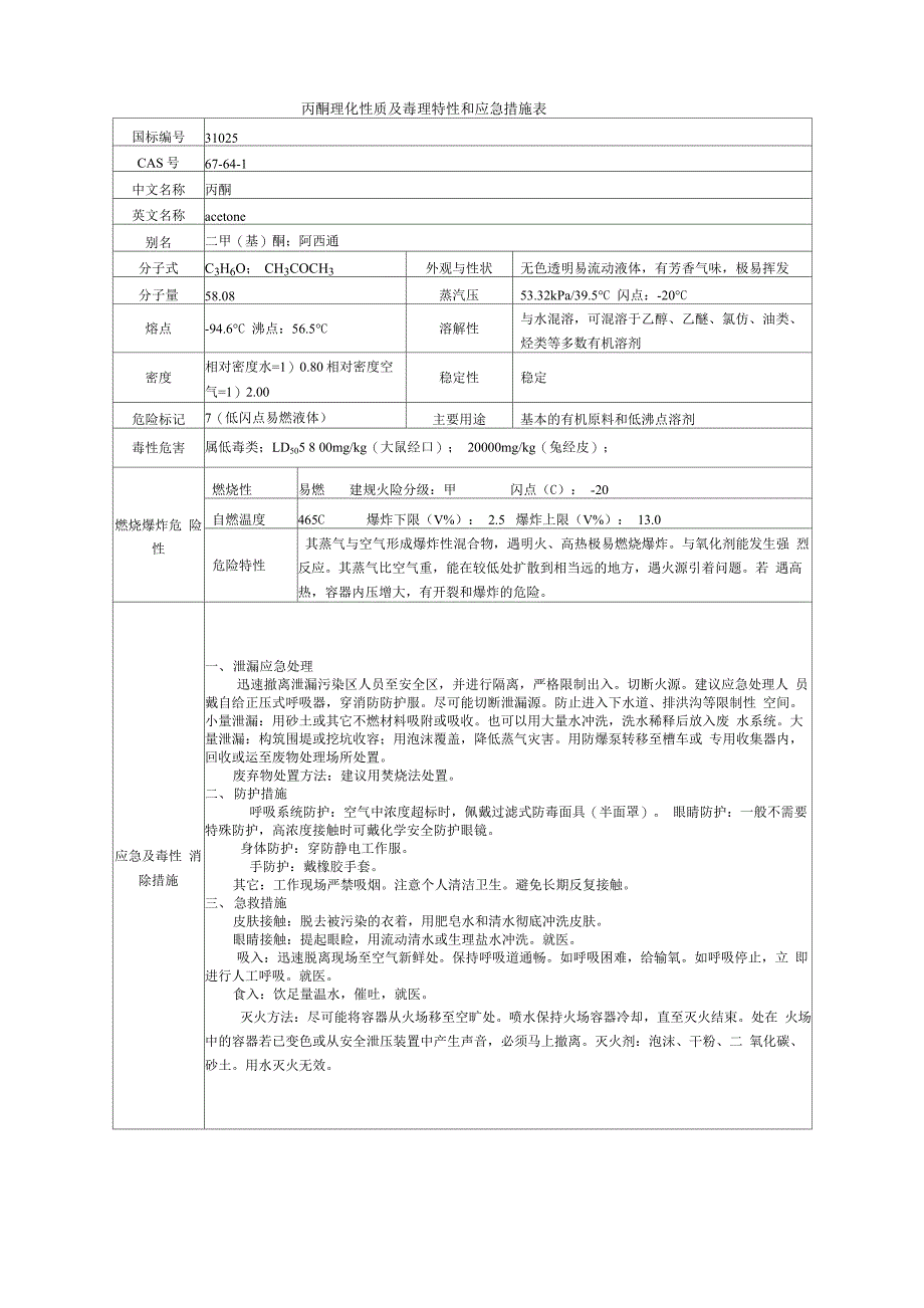 丙酮理化性质及毒理特性和应急措施表国标编号31025CAS号67-64-1中文名称丙酮英文名称acetone别名二甲(基)酮;阿西通分子式c3h6o; ch3coch3外观与性状无色透明易流动液体,有芳香气味,极易挥发分子量58.08蒸汽压53.32kPa/39.5°C 闪点:-20°C熔点-94.6°C 沸点:56.5°C溶解性与水混溶,可混溶于乙醇、乙醚、氯仿、油类、 烃类等多数有机溶剂密度相对密度水=1)0.80相对密度空气=1)2.00稳定性稳定危险标记7(低闪点易燃液体)主要用途基本的有机原料和低沸点溶剂毒性危害属低毒类;LD505 8 00mg/kg(大鼠经口); 20000mg/kg(兔经皮);燃烧爆炸危 险性燃烧性易燃 建规火险分级:甲 闪点(C): -20自燃温度465C 爆炸下限(V%): 2.5 爆炸上限(V%): 13.0危险特性其蒸气与空气形成爆炸性混合物,遇明火、高热极易燃烧爆炸与氧化剂能发生强 烈反应其蒸气比空气重,能在较低处扩散到相当远的地方,遇火源引着问题若 遇高热,容器内压增大,有开裂和爆炸的危险应急及毒性 消除措施一、 泄漏应急处理迅速撤离泄漏污染区人员至安全区,并进行隔离,严格限制出入。