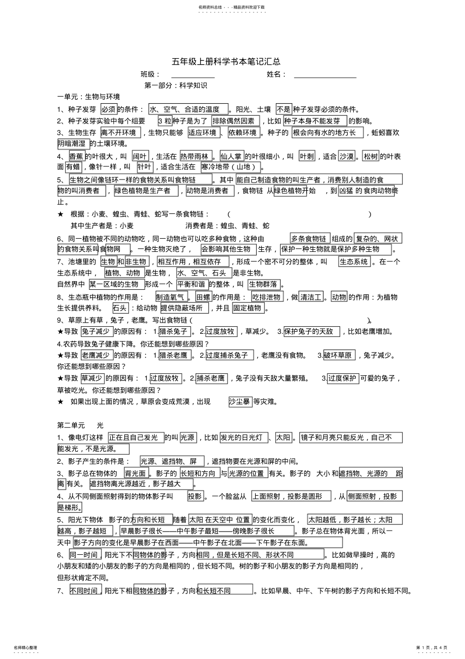 五年级上册科学书本笔记汇总班级:姓名:第一部分:科学知识一单元:生物与环境1、种子发芽 必须 的条件: 水、空气、合适的温度阳光、土壤不是 种子发芽必须的条件2、种子发芽实验中每个组要3 粒种子是为了 排除偶然因素,比如 种子本身不能发芽的影响3、生物生存 离不开环境 ,生物只能够 适应环境 、依赖环境 种子的 根会向有水的地方长,蚯蚓喜欢阴暗潮湿 的土壤环境4、香蕉 的叶很大,叫 阔叶 ,生活在 热带雨林 仙人掌 的叶很细小,叫叶刺 ,适合 沙漠 松树 的叶表面 有蜡 ,像针一样,叫针叶 ,适合生活在 寒冷地带(山地) 5、 生物之间像链环一样的食物关系叫食物链其中 能自己制造食物的叫生产者,消费别人制造的食物的叫消费者, 绿色植物是生产者,动物是消费者,食物链 从绿色植物开始,到 凶猛 的食肉动物终止 根据:小麦、蝗虫、青蛙、蛇写一条食物链:()其中生产者是:小麦消费者是:蝗虫、青蛙、蛇6、同一植物被不同的动物吃,同一动物也可以吃多种食物,这种由多条食物链组成的 复杂的、网状的食物关系叫食物网一种生物灭绝了,会影响其他生物生存, 保护一种生物就是保护多种生物7、池塘里的 生物 和非生物 , 相互作用,相互依存,形成一个密不可分的整体,叫生态系统 。