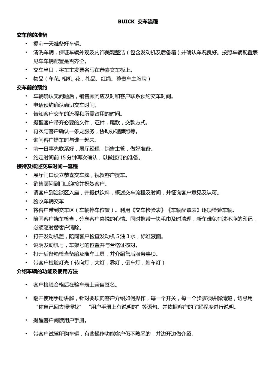 BUICK 交车流程交车前的准备•提前一天准备好车辆•清洗车辆,保证车辆外观及内饰美观整洁(包含发动机及后备箱)并确认车况良好按照车辆配置表见车车辆配置是否齐全•交车当日,将车主发票名写在恭喜交车板上•物品(车花, 相机, 花,礼品、红绳、尊贵车主胸牌)交车前的预约•车辆确认无问题后,销售顾问应及时和客户联系预约交车时间•预约确认确切交车时间•告知客户交车的流程和所需占用的时间•提醒客户带齐必要的文件,证件,尾款,交款方式•再次与客户确认一条龙服务,协助办理牌照等•询问客户提车时与谁一起来•前一日事先联系好,展厅经理,销售主管,做好准备•约定时间前 15 分钟再次确认,以做接待的准备接待及概述交车时间一流程•展厅门口设立恭喜交车牌,祝贺客户提车•销售顾问到门口迎接并祝贺客户•请客户到洽谈区入座,并提供饮料,概述交车流程及时间,并征询客户意见及认可 •验收车辆交车•将客户带到交车区(车辆停车位置)利用《交车检验表》《车辆配置表》逐项检验车辆•陪同客户绕车检查,分享客户喜悦的心情同时携带一块毛巾及时清理,新车难免有洗不净的印记,必须随时替客户清除•打开发动机盖,陪同客户检查发动机 5 油 3 水,标准液面。