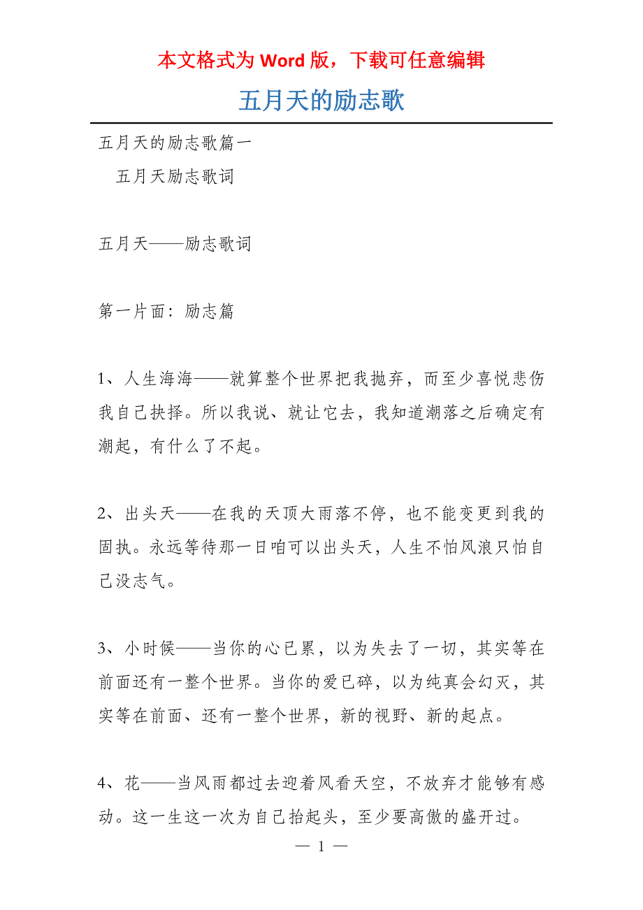 本文格式为Word版,下载可任意编辑五月天的励志歌 五月天的励志歌篇一 五月天励志歌词 五月天——励志歌词 第一片面:励志篇 1、人生海海——就算整个世界把我抛弃,而至少喜悦悲伤我自己抉择所以我说、就让它去,我知道潮落之后确定有潮起,有什么了不起 2、出头天——在我的天顶大雨落不停,也不能变更到我的固执永远等待那一日咱可以出头天,人生不怕风浪只怕自己没志气。