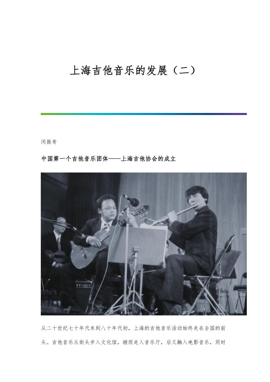 上海吉他音乐的发展(二) 闵振奇中国第一个吉他音乐团体——上海吉他协会的成立从二十世纪七十年代末到八十年代初,上海的吉他音乐活动始终走在全国的前头吉他音乐从街头步入文化馆,继而走入音乐厅,后又融入电影音乐,同时得到了政府部门的关注及著名音乐家们的支持然而,八十年代以前,全国还没有吉他音乐团体,琴友们都是私下切磋技艺,上海的琴友们也都是如此我曾经与上海音乐家协会吉他专业委员会的老师们在一起聊天,谈起过那个年代的一桩趣事故事发生在1973年初的上海小南门那时候的小南门还属于南市区,有着很多老弄堂,里面大多都是久经风霜、陈旧不堪的旧房子,还藏着不少老字号店铺,有开了几十年的理发店、烟纸店等,勾勒出一幅原汁原味的老上海风情因为老弄堂里的房子实在过于狭小密集,居住起来十分压抑,那时的上海人都称这些房子为“鸽子房”据闵元禔回忆,有一位琴友的家就在小南门的“鸽子房”,大家曾到他家以琴会友走进那条两旁都是民宅的狭窄街巷,照着门牌摸到那狭小的门洞,颤颤巍巍地爬过陡峭的楼梯,上到“鸽子房”的三层阁一间十五平米左右的小屋里挤满了来客客人多得椅子都不够,只好将就坐小板凳,一张床铺的两边床沿上,居然挤下了十三个人,晚到的朋友便席地而坐。