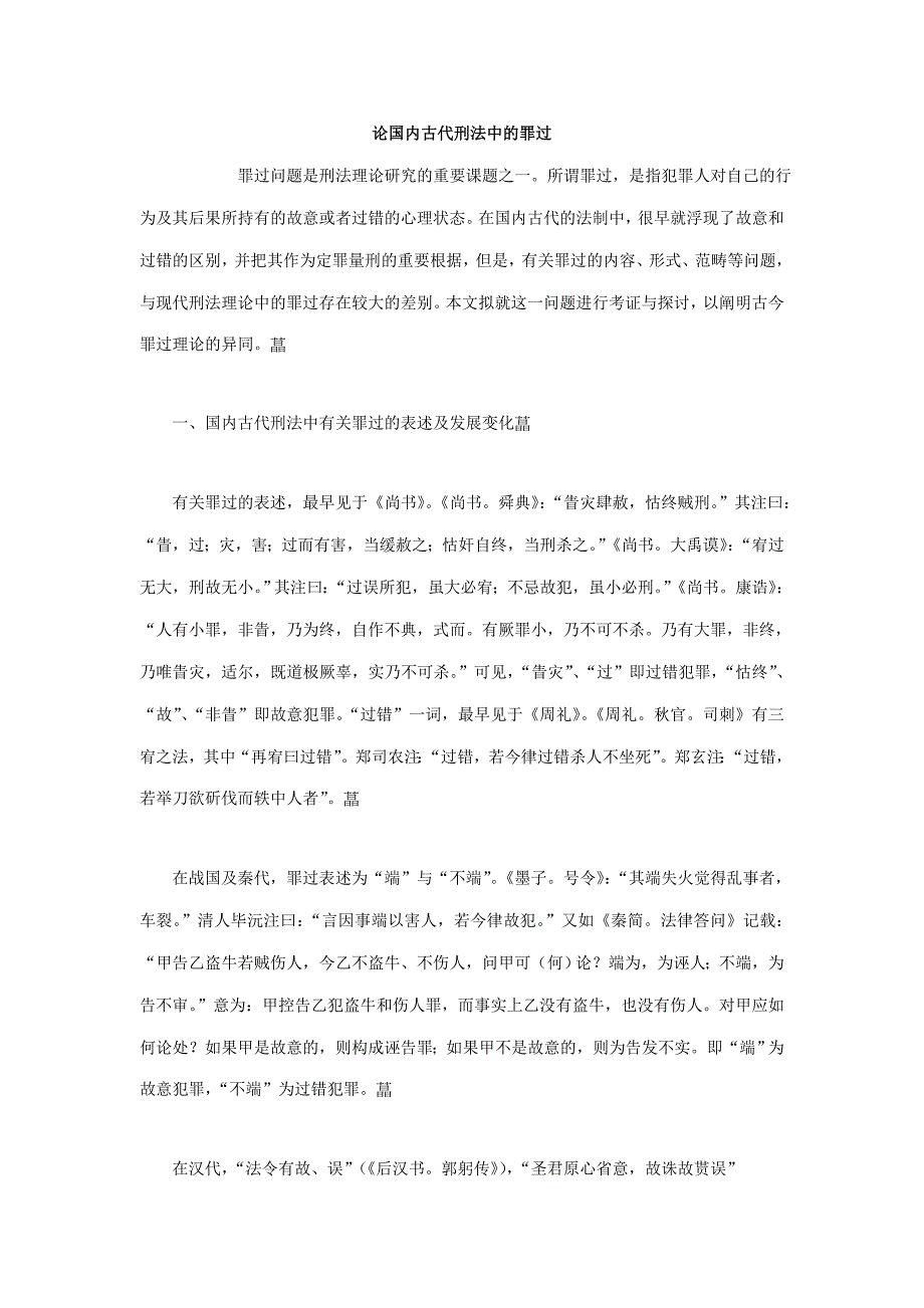 论国内古代刑法中的罪过 罪过问题是刑法理论研究的重要课题之一所谓罪过,是指犯罪人对自己的行为及其后果所持有的故意或者过错的心理状态在国内古代的法制中,很早就浮现了故意和过错的区别,并把其作为定罪量刑的重要根据,但是,有关罪过的内容、形式、范畴等问题,与现代刑法理论中的罪过存在较大的差别本文拟就这一问题进行考证与探讨,以阐明古今罪过理论的异同 一、国内古代刑法中有关罪过的表述及发展变化 有关罪过的表述,最早见于《尚书》舜典》:“眚灾肆赦,怙终贼刑其注曰:“眚,过;灾,害;过而有害,当缓赦之;怙奸自终,当刑杀之大禹谟》:“宥过无大,刑故无小其注曰:“过误所犯,虽大必宥;不忌故犯,虽小必刑康诰》:“人有小罪,非眚,乃为终,自作不典,式而有厥罪小,乃不可不杀乃有大罪,非终,乃唯眚灾,适尔,既道极厥辜,实乃不可杀可见,“眚灾”、“过”即过错犯罪,“怙终”、“故”、“非眚”即故意犯罪过错”一词,最早见于《周礼》司刺》有三宥之法,其中“再宥曰过错”郑司农注:“过错,若今律过错杀人不坐死”郑玄注:“过错,若举刀欲斫伐而轶中人者” 在战国及秦代,罪过表述为“端”与“不端”。