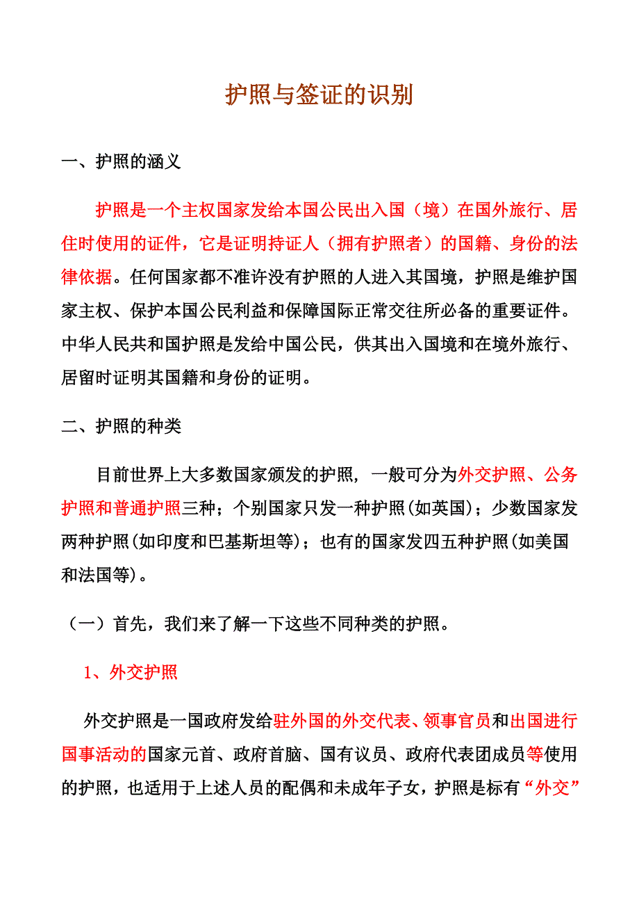 护照与签证的识别一、护照的涵义护照是一个主权国家发给本国公民出入国(境)在国外旅行、居住时使用的证件,它是证明持证人(拥有护照者)的国籍、身份的法律依据任何国家都不准许没有护照的人进入其国境,护照是维护国家主权、保护本国公民利益和保障国际正常交往所必备的重要证件中华人民共和国护照是发给中国公民,供其出入国境和在境外旅行、居留时证明其国籍和身份的证明二、护照的种类 目前世界上大多数国家颁发的护照, 一般可分为外交护照、公务护照和普通护照三种;个别国家只发一种护照(如英国);少数国家发两种护照(如印度和巴基斯坦等);也有的国家发四五种护照(如美国和法国等)一)首先,我们来了解一下这些不同种类的护照1、外交护照外交护照是一国政府发给驻外国的外交代表、领事官员和出国进行国事活动的国家元首、政府首脑、国有议员、政府代表团成员等使用的护照,也适用于上述人员的配偶和未成年子女,护照是标有“外交”DIPLOMATIC字样持有外交护照的人,在国外受到尊重和礼遇,有的享有外交特权与豁免 2、公务护照 公务护照也称官员护照、是发给出国从事各种公务活动的人员,如政府一般官员,驻外使、领馆工作人员以及派往国外执行文化、经济等任务的人员等。