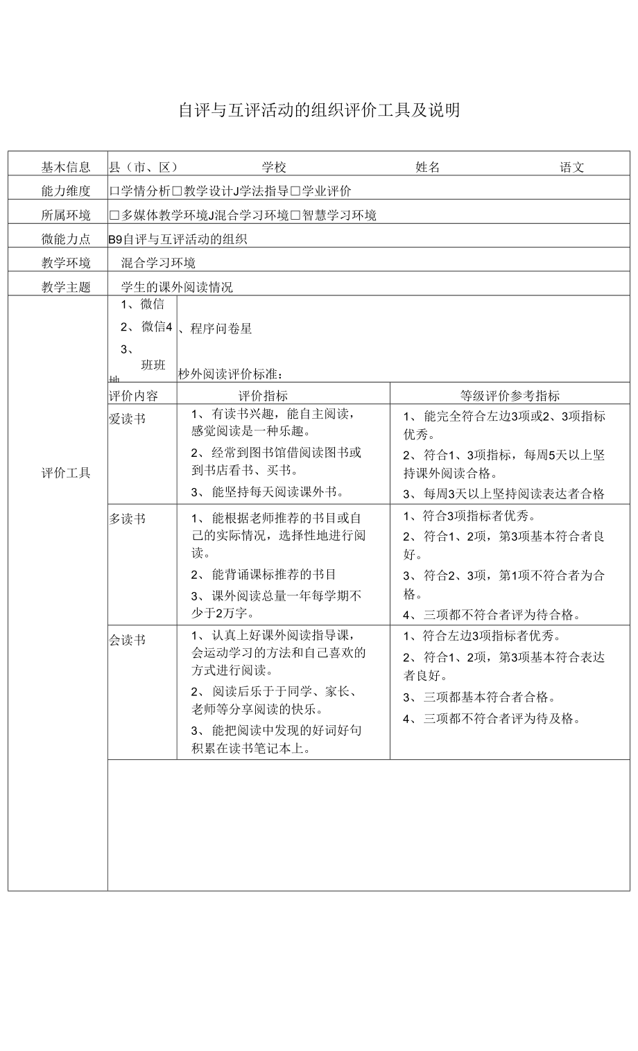 自评与互评活动的组织评价工具及说明基木信息县(市、区) 学校 姓名 语文能力维度口学情分析□教学设计J学法指导□学业评价所属环境□多媒体教学环境J混合学习环境□智慧学习环境微能力点B9自评与互评活动的组织教学环境混合学习环境教学主题学生的课外阅读情况评价工具1、 2、 43、 班班地4、 学生调、程序问卷星杪外阅读评价标准:评价内容评价指标等级评价参考指标爱读书1、 有读书兴趣,能自主阅读, 感觉阅读是一种乐趣2、 经常到图书馆借阅读图书或 到书店看书、买书3、 能坚持每天阅读课外书1、 能完全符合左边3项或2、3项指标 优秀2、 符合1、3项指标,每周5天以上坚 持课外阅读合格3、 每周3天以上坚持阅读表达者合格多读书1、 能根据老师推荐的书目或自 己的实际情况,选择性地进行阅 读2、 能背诵课标推荐的书目3、 课外阅读总量一年每学期不 少于2万字1、 符合3项指标者优秀2、 符合1、2项,第3项基本符合者良 好3、 符合2、3项,第1项不符合者为合 格4、 三项都不符合者评为待合格会读书1、 认真上好课外阅读指导课, 会运动学习的方法和自己喜欢的 方式进行阅读2、 阅读后乐于于同学、家长、 老师等分享阅读的快乐。
